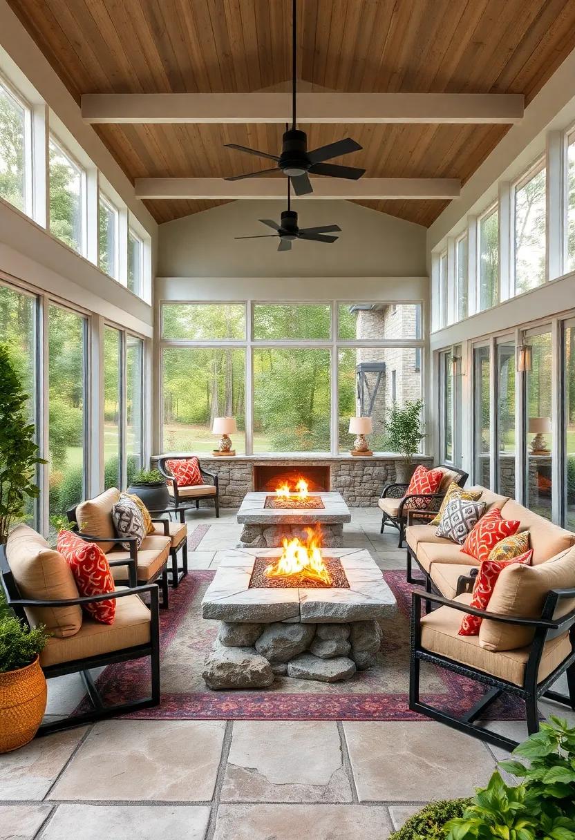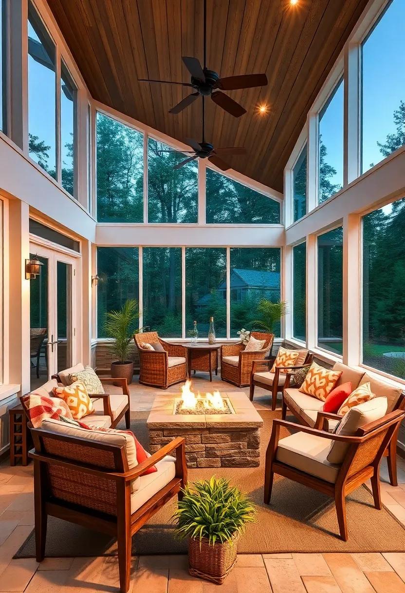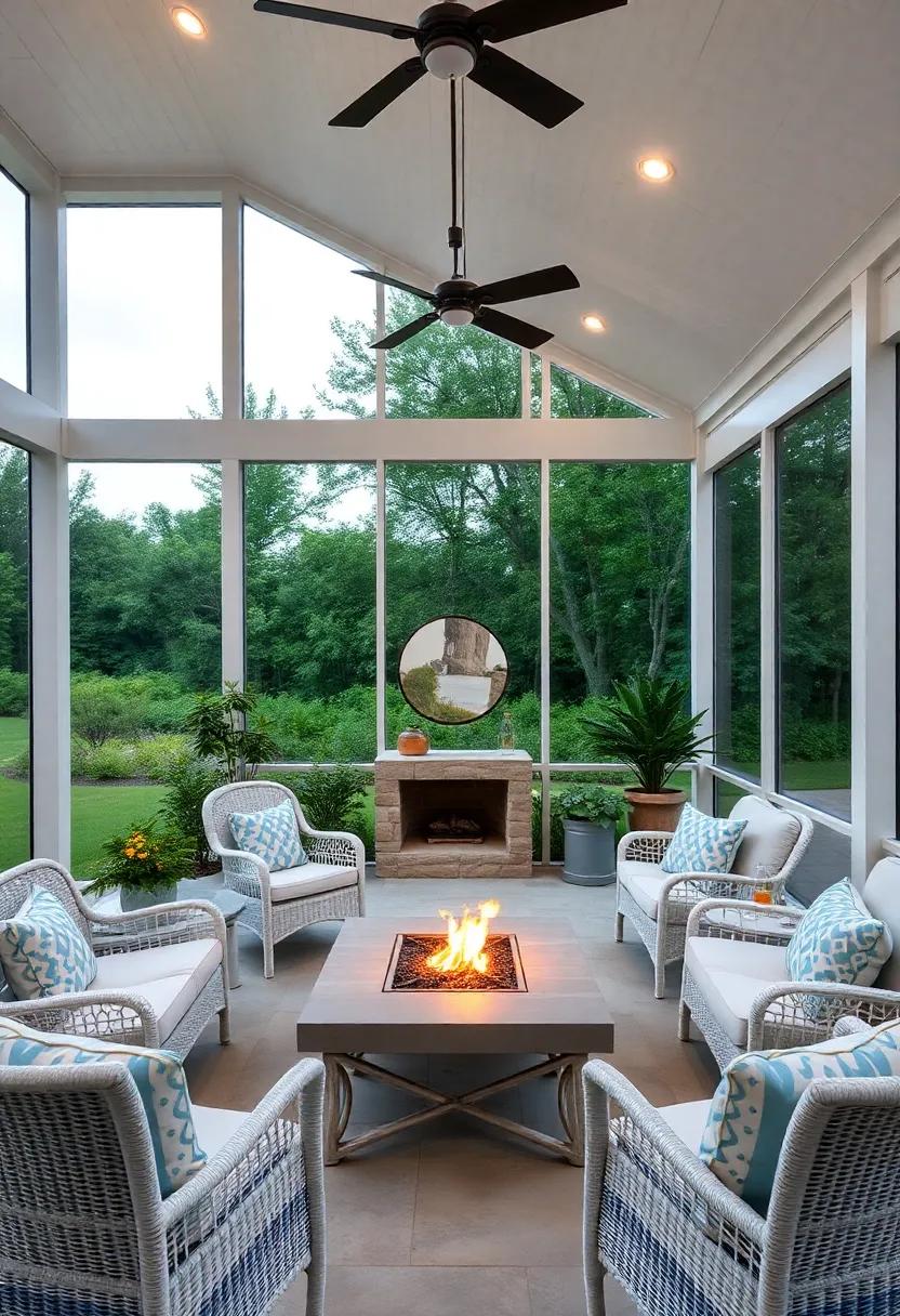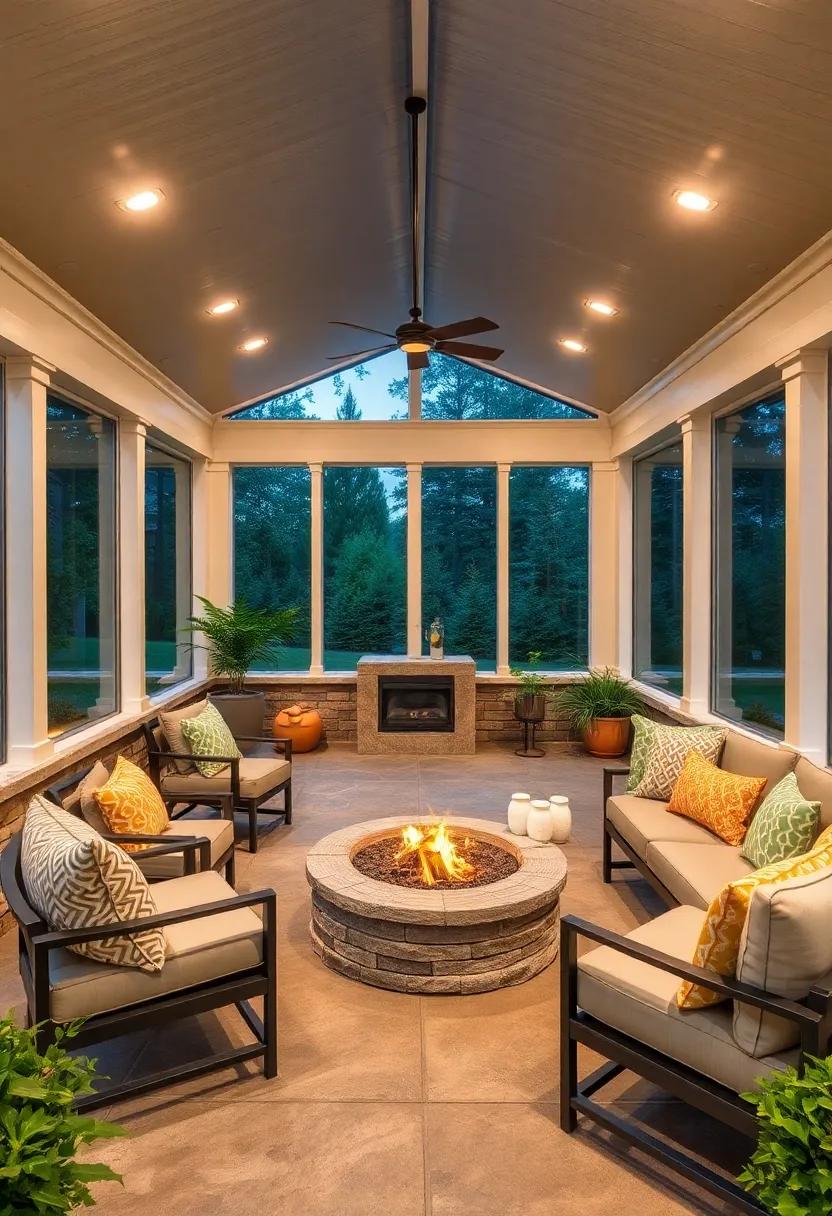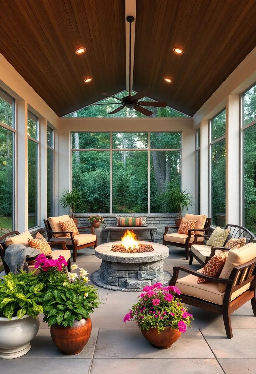Imagine transforming your screened porch into a sanctuary where the boundaries between indoors and outdoors dissolve. Large windows serve as expansive canvases, framing the beauty of nature and bathing the space in natural light. Picture the sunlight streaming in, casting warm, golden hues across a vibrant seating area adorned with bright cushions and throws. Create an inviting atmosphere by integrating a tiled fire pit, whose flickering flames can illuminate the porch as twilight descends, filling the air with warmth and a touch of magic.