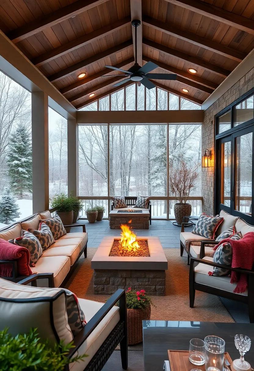 snowy Retreat: Create a winter wonderland with insulated seating, warm throws, and a fire pit that ensures cozy warmth during colder months