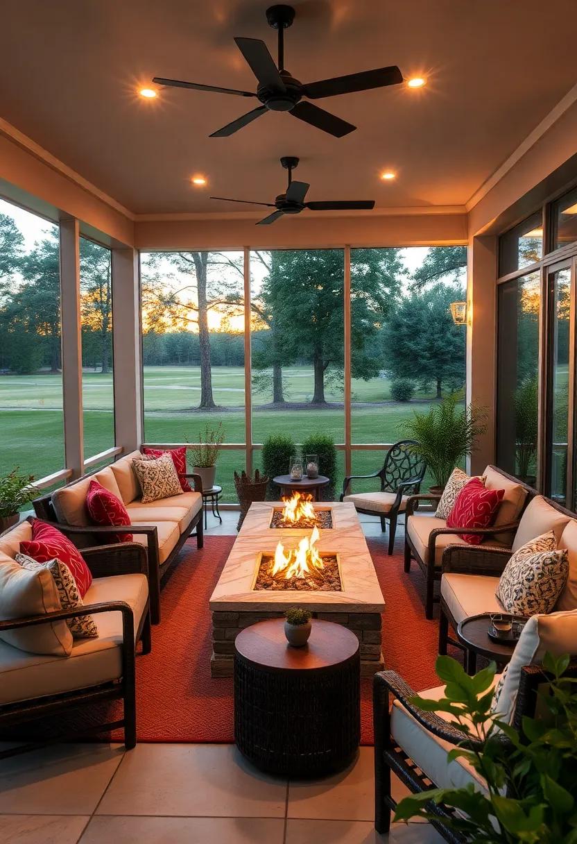 Enclosed paradise: Design a screened enclosure filled with plush seating, allowing for bug-free enjoyment of a central fire pit and a flickering glow
