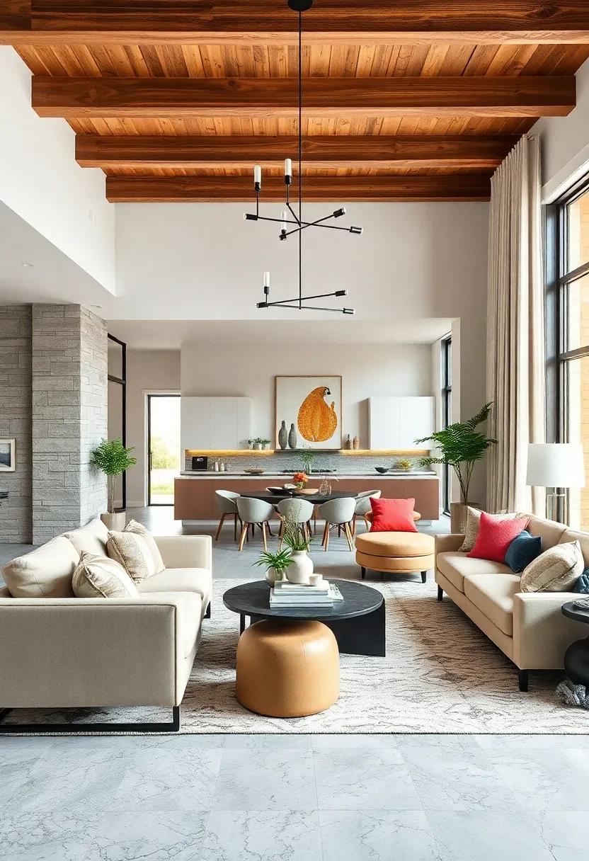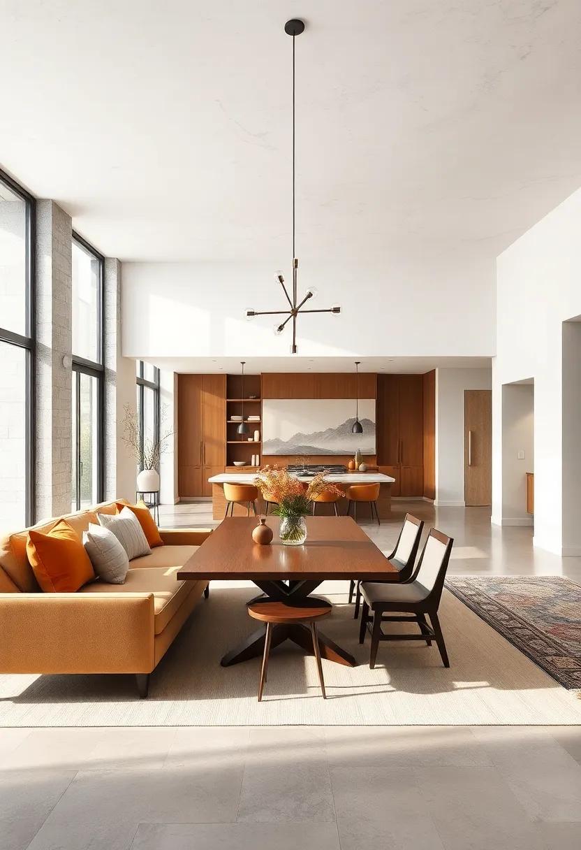 geometric Patterns: See how geometric shapes in rugs or wall art can bring dynamism to the space, drawing the eye across the open layout seamlessly