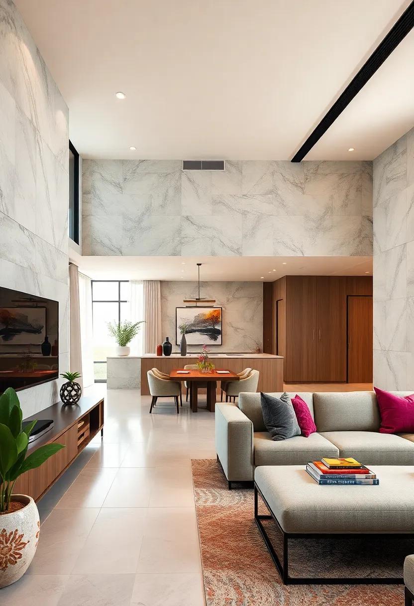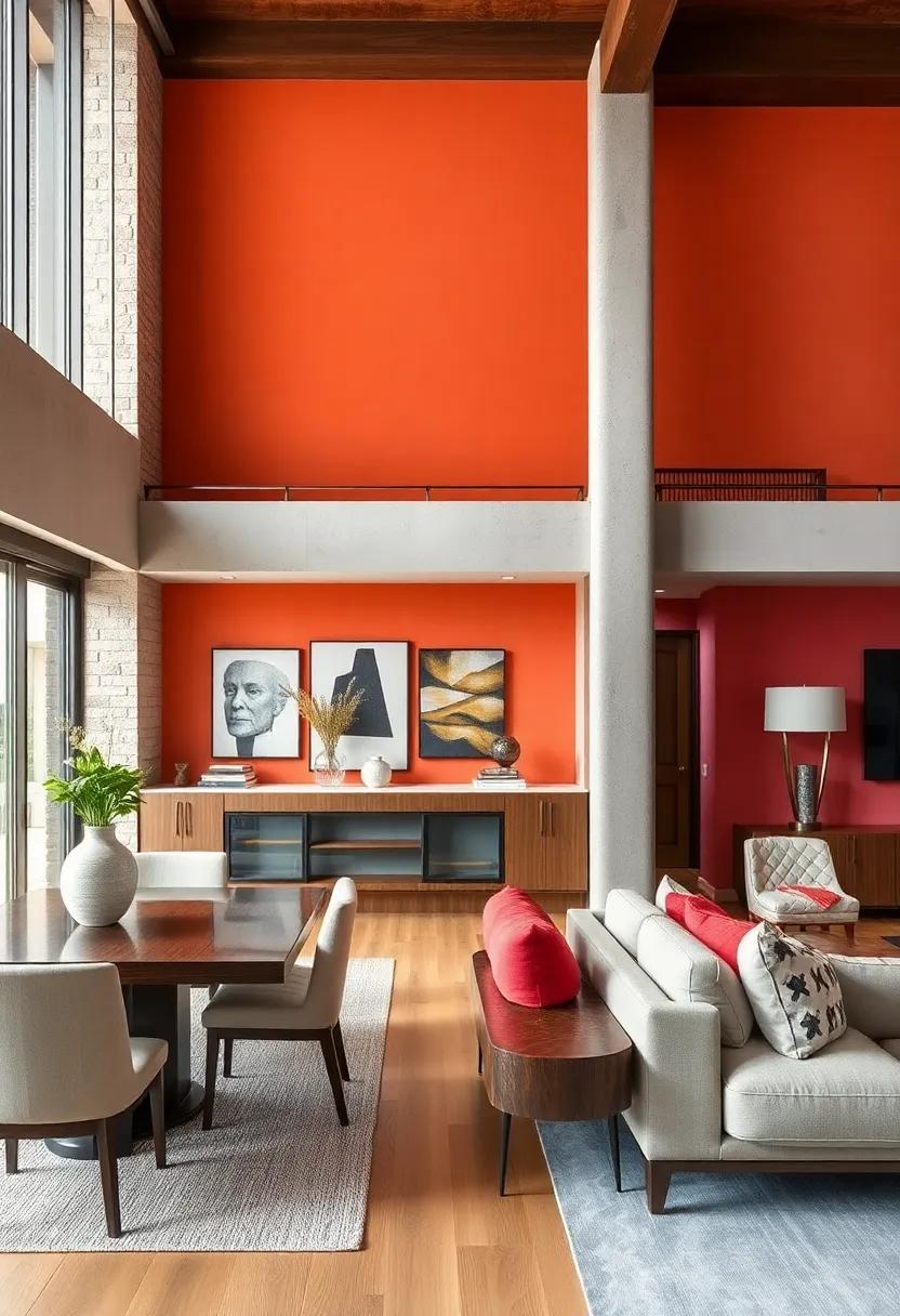 Bold Color Statements: See how an accent wall in a bright hue can define the dining space, creating a striking contrast against softer tones in the living area