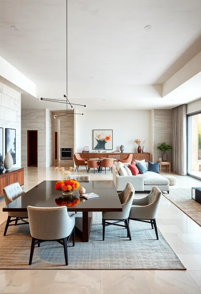 Effective furniture arrangement can transform your open-concept space into a harmonious blend of living and dining areas. Start by selecting defining pieces that serve dual purposes while delineating the areas. Consider a stylish sofa that faces the dining area, creating a natural boundary yet inviting connectivity for conversation.Accent rugs can also play a pivotal role: a bold, graphic pattern under the dining table visually anchors it, while a softer, textured rug in the living area adds warmth.Additionally, incorporating a coffee table with a unique shape can definitely help emphasize the living zone, lending a touch of personality without sacrificing flow.