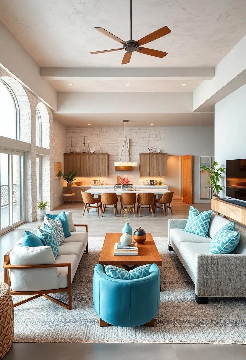 Transform your space into a coastal retreat by integrating a palette of soft pastels and muted neutrals that evoke the serenity of sandy beaches and sunny skies. Think shades of seafoam green, sandy beige, and crisp whites that reflect the natural surroundings and allow light to bounce throughout your open-concept area. Layer these hues with casual, relaxed furnishings like oversized linen sofas and driftwood coffee tables to maintain an inviting, laid-back vibe. Accentuate your design with elements of nature, such as bamboo curtains or woven jute rugs, which ground the aesthetic while adding texture that echoes seaside charm.