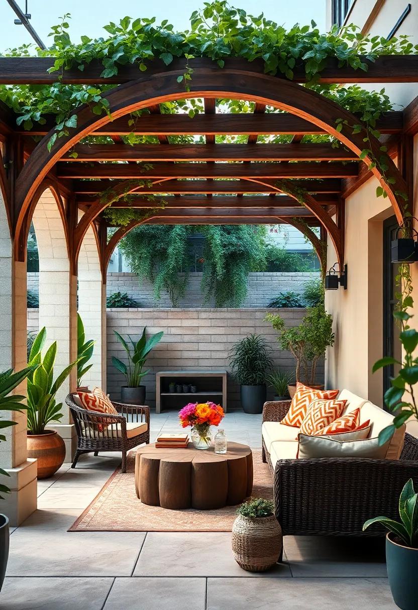Go bold with an oversized arched trellis made from reclaimed wood, perfect for supporting lush vines and bringing a touch of nature to your urban patio