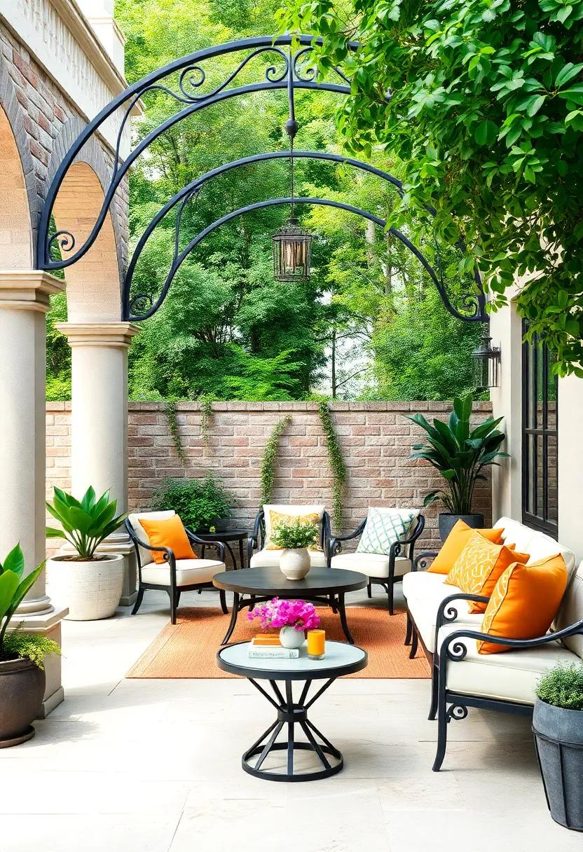 Bring elegance to your patio with a wrought iron arched trellis, its intricate details making it a sophisticated accent that complements high-end furniture