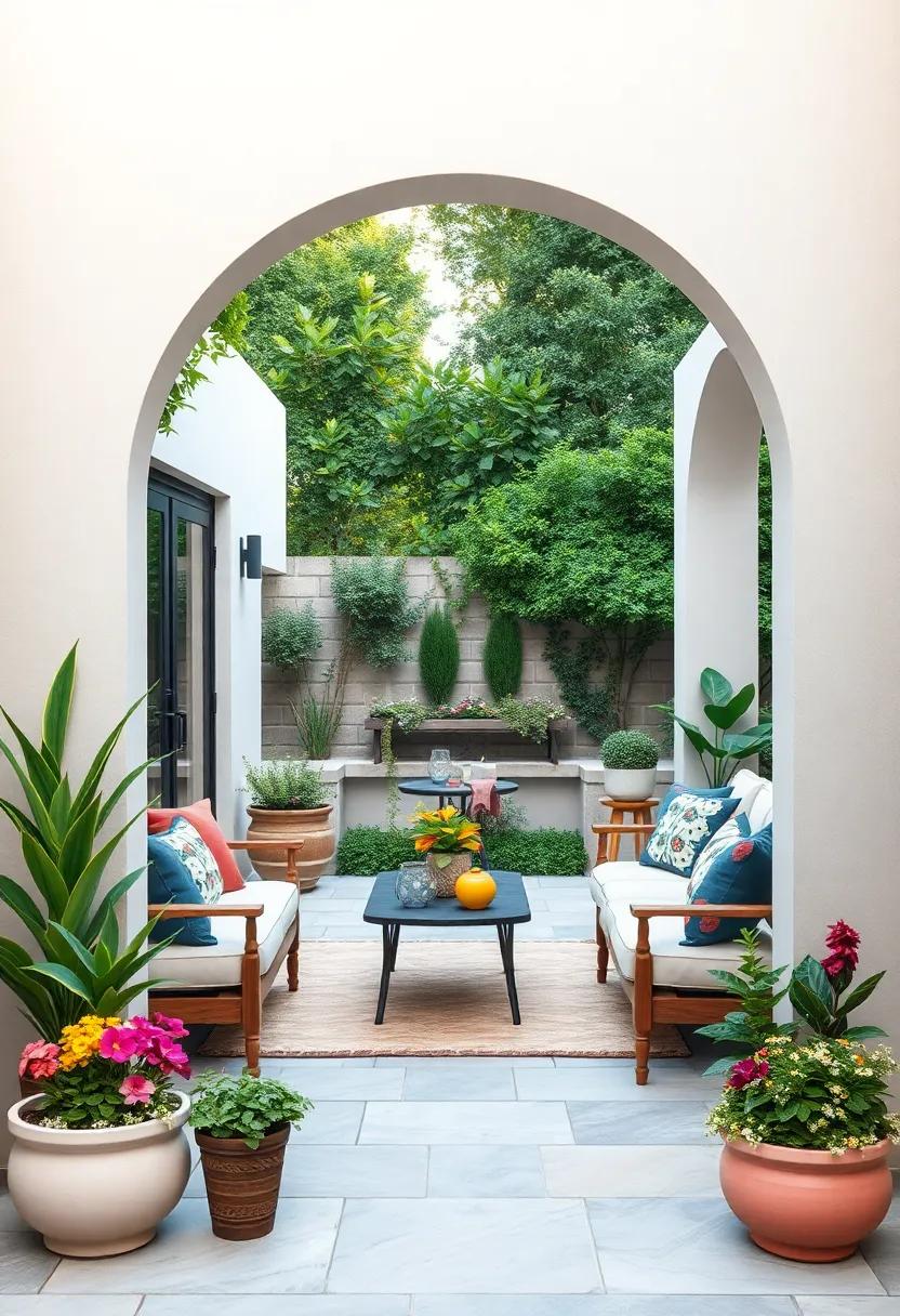 Use a patio corner to your advantage by positioning an arched trellis with a small seating area, creating an intimate gathering spot surrounded by lush greenery