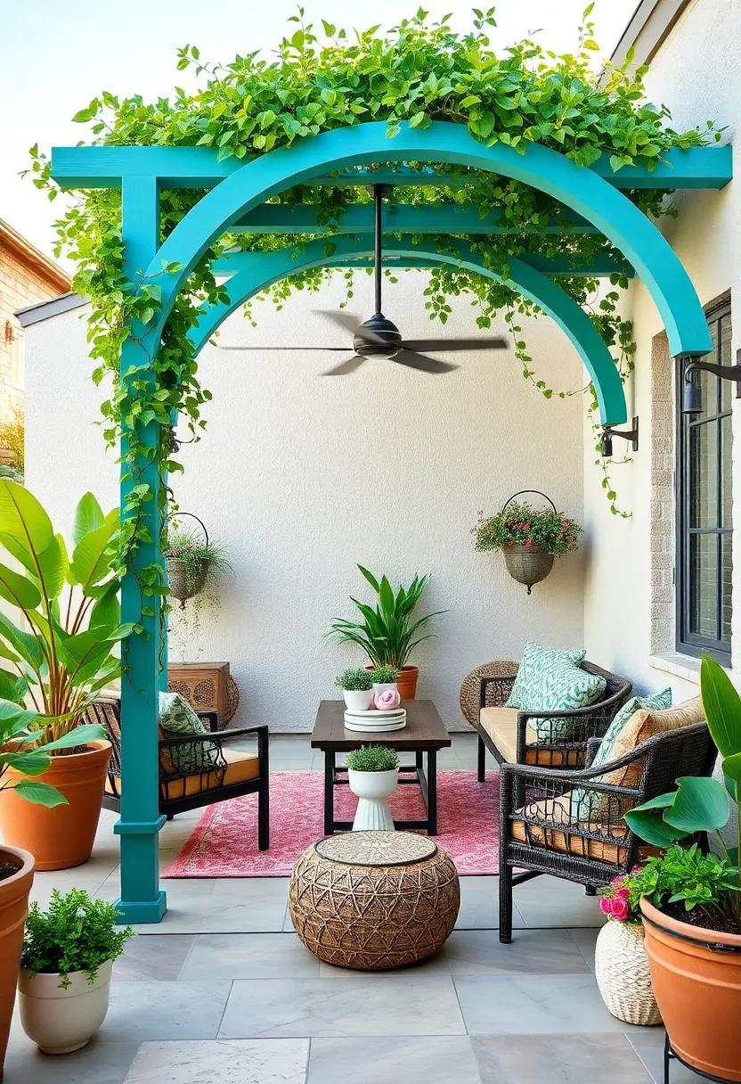 Let your creativity shine with a DIY arched trellis painted in a cheerful hue, adding personality and charm to your patio while showcasing climbing greenery