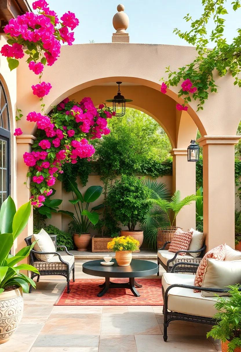 Transform your patio into a Mediterranean oasis with a stucco finial-topped arched trellis, draped in vibrant bougainvillea for a touch of color and texture