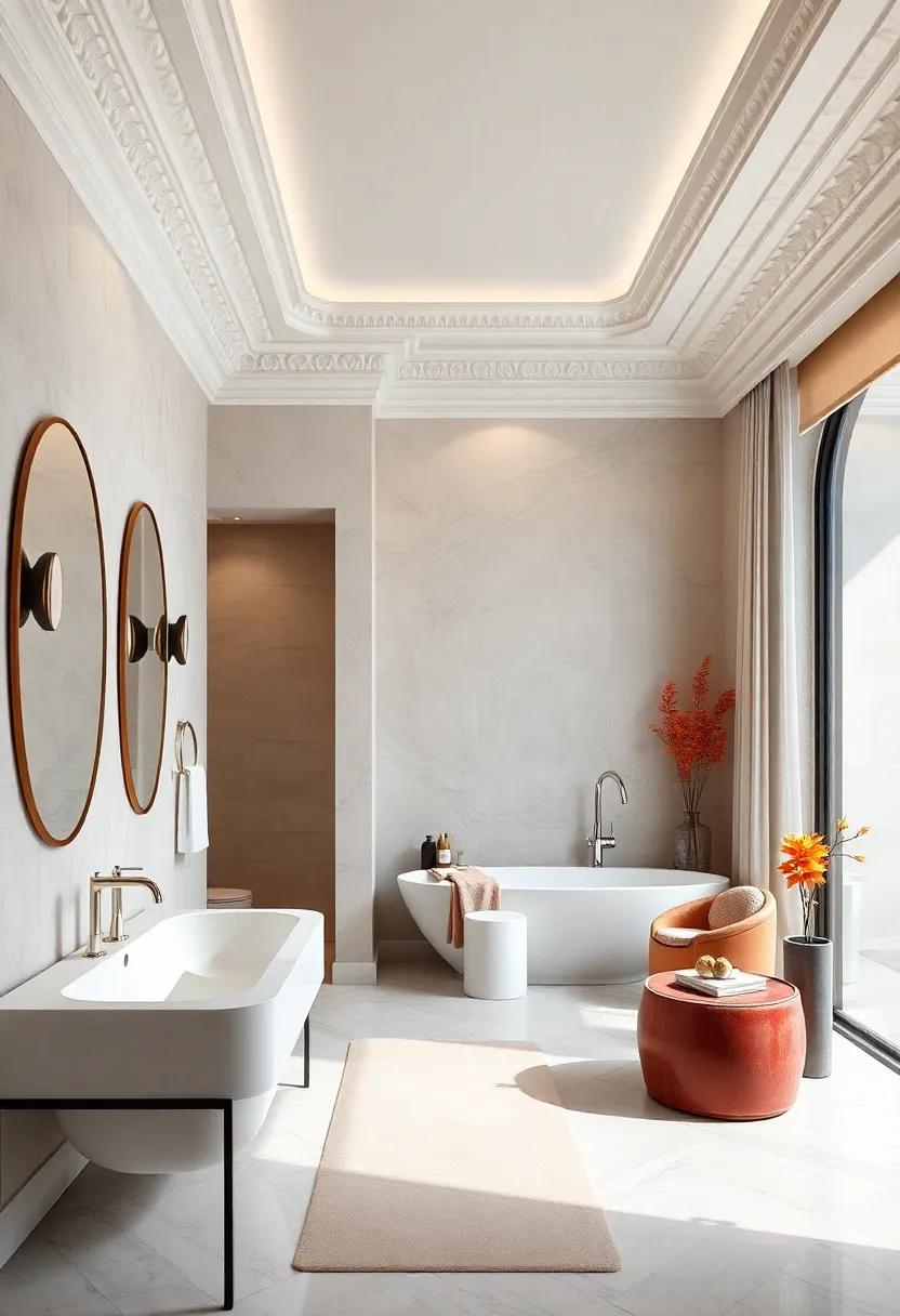 To elevate the elegance of your bathroom, consider incorporating intricate crown molding that defines the space and creates a polished ambience.The delicate design of the crown molding enhances the transition between the walls and ceiling, adding a luxurious touch that complements both ivory and pearl hues. Opt for styles that feature scrollwork or geometric patterns to bring a unique visual element, serving as a work of art in itself. When chosen delicately, light can play off these contours, creating soft shadows that enhance the room’s serene atmosphere.