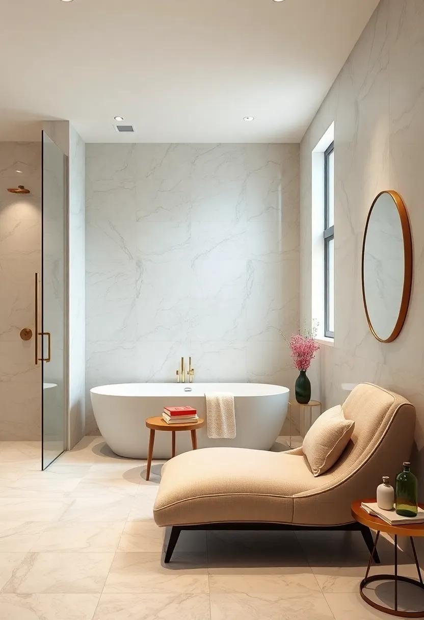 Transform a cozy nook in your exquisite bathroom into a personal oasis with a plush chaise lounge or a beautifully crafted armchair. Choose chairs upholstered in soft, muted tones of ivory and pearl to complement your serene surroundings. Position this haven near a window to enjoy natural light and tranquil views, or place it strategically near a fireplace for a warm ambience. Add a small side table to hold your favorite reads or a cup of herbal tea, elevating the experience of unwinding in this luxurious space.