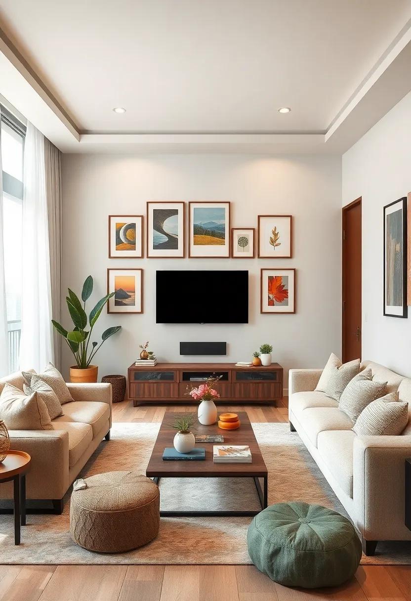 When arranging your artwork, lay out the frames on the floor first to find the perfect combination before committing to the wall.This will help you visualize spacing and balance. Use simple frames to keep the focus on the art itself, and allow negative space to become part of the overall design. Accent the wall with shelves for additional decor-think small plants or sculptural elements-that complement your art without crowding. This mixture not only enhances the stylistic elements but also maximizes visual interest in your entertainment area.