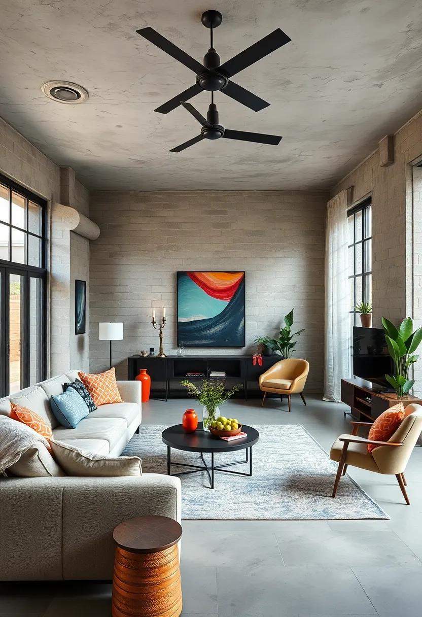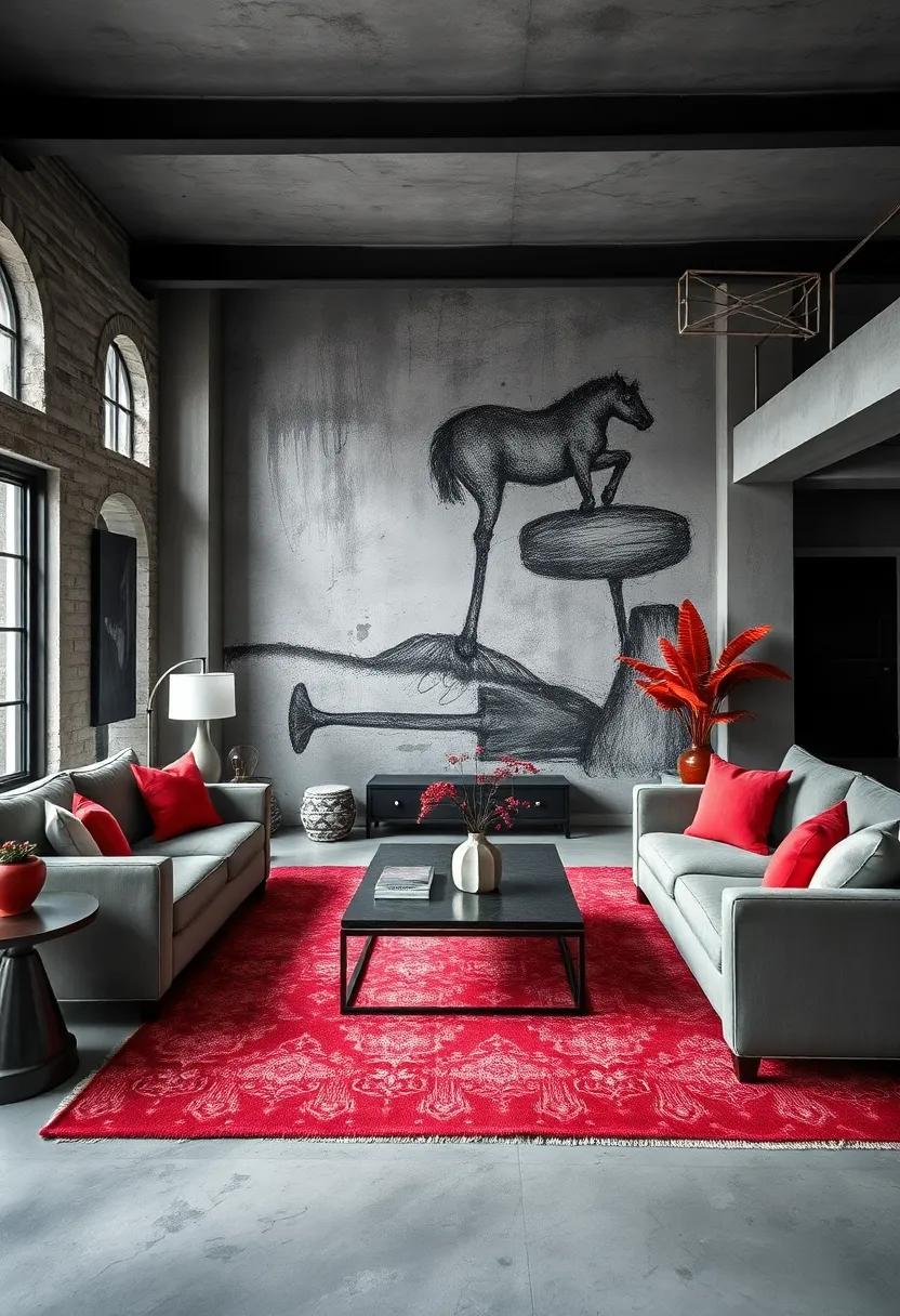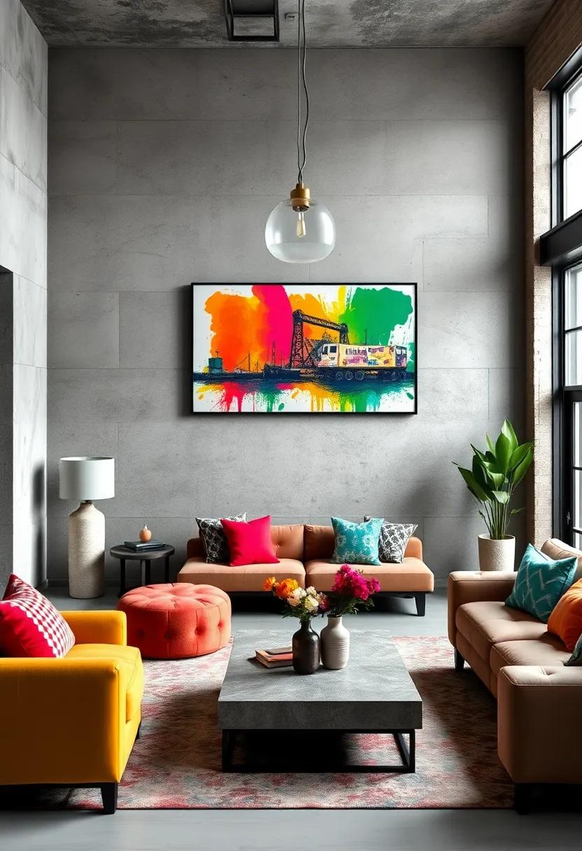 create a vivid focal point in your industrial living space by curating a gallery wall that bursts with color and personality.Choose large-scale artworks that flaunt playful patterns and vibrant hues, making a striking contrast against the cold, polished concrete walls. Mix and match styles, from abstract pieces that spark curiosity to bold portraits that evoke emotion. The goal is to invite lively energy into the space while showcasing a blend of artistic expressions that tell a story. Make sure to arrange the artwork in a way that provides a sense of balance, perhaps clustering pieces that complement each other in tone and theme.