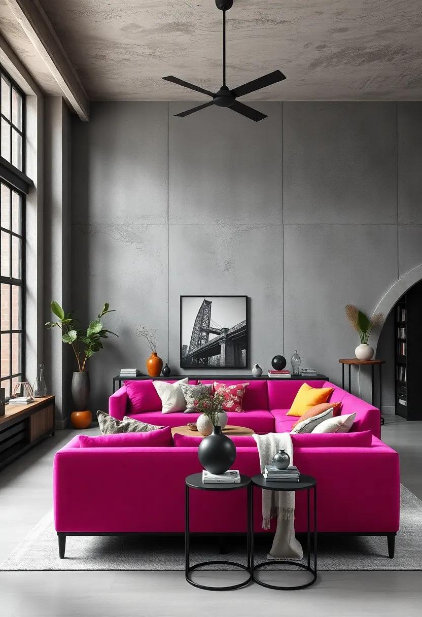 To break this series of grays and add a jolt of excitement, introduce a striking fuchsia couch that captures attention and serves as the room’s centerpiece.The bold contrast between the soft nuanced gray and the vibrant hues of fuchsia not only enlivens the space but also reflects a modern artistic vision.Accessorize your couch with pillows that blend shades of gray and fuchsia, creating a cohesive look that balances boldness with subtlety. The interplay of industrial elements with this daring color choice invites both enjoyment and comfort-perfect for social gatherings or serene evenings.