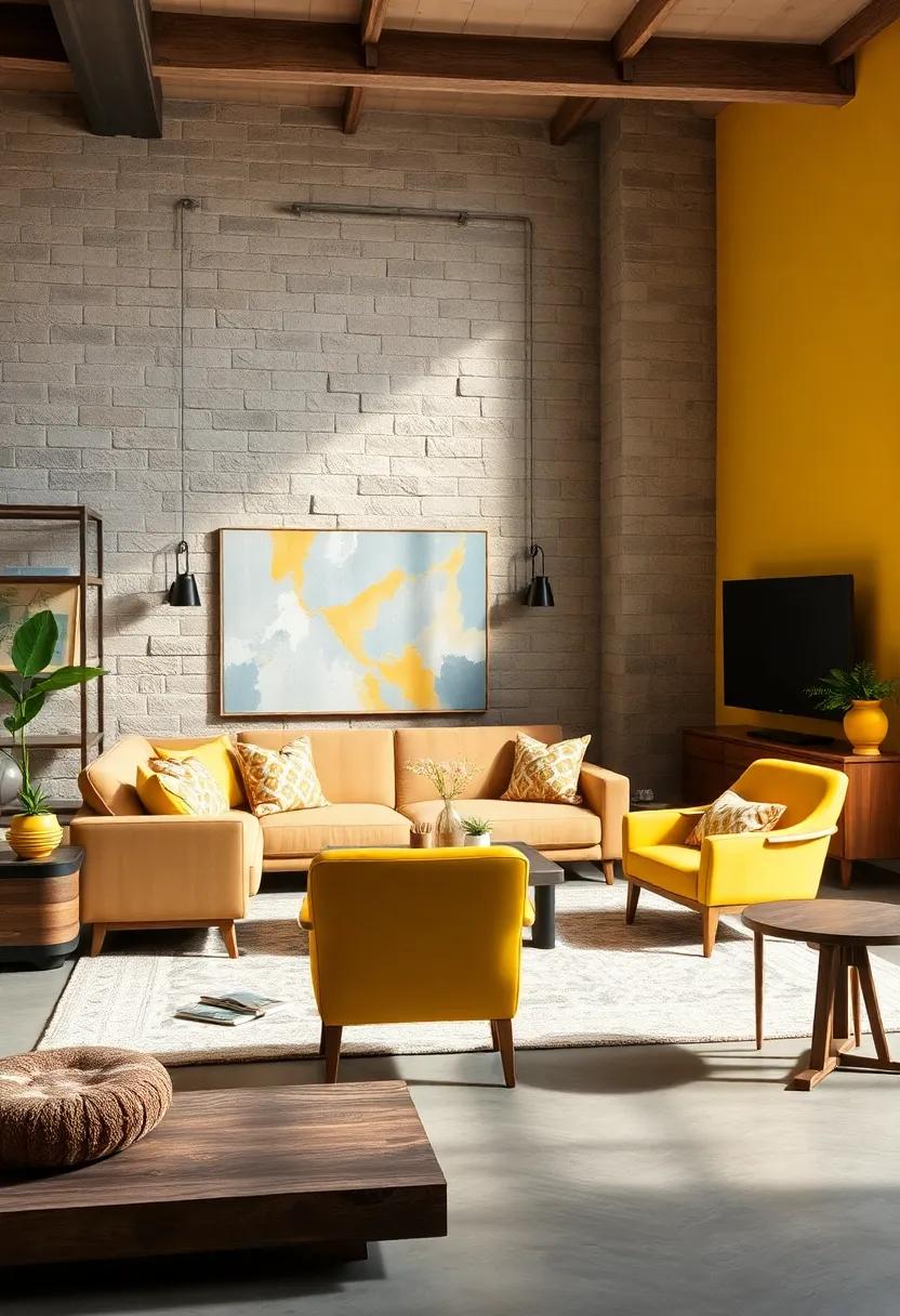 Combining the rustic charm of reclaimed wood with vibrant yellow accents can transform an industrial living room into a space that exudes warmth and character. Think reclaimed wood furniture, such as a coffee table or TV stand, paired with bright yellow accent chairs that draw the eye. The mix of materials creates a striking contrast, where the rough texture of the wood softens the bold vibrancy of the yellow, resulting in a balanced aesthetic. Accessorize with decorative items-like a yellow throw blanket or cushions-to echo the chair’s hue and create cohesion within the room.