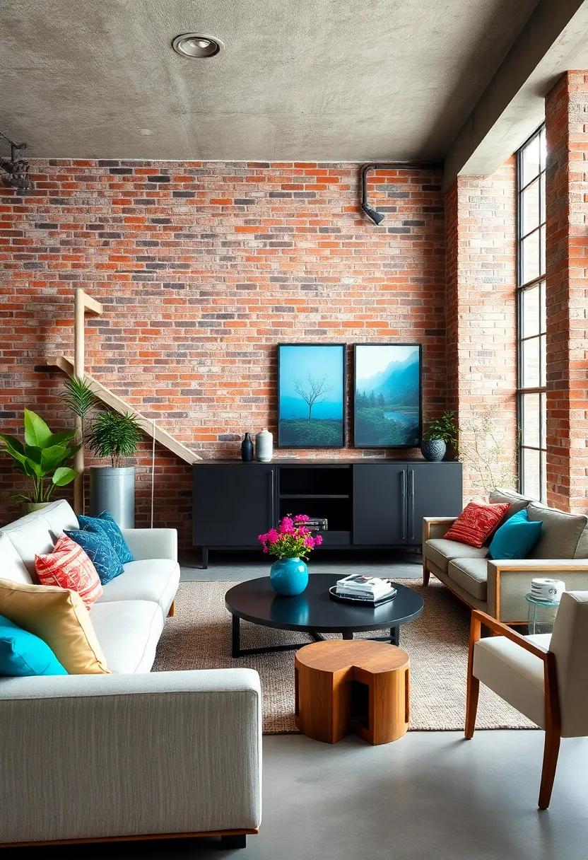 Transform your industrial living space by showcasing the raw beauty of original brick walls, allowing their rugged charm to become the focal point of the room.To create an engaging contrast, consider incorporating vibrant teal accents that breathe life into the space. Think plush cushions in rich teal fabric, which not only provide comfort but also serve as a bold statement against the earthy texture of the brick. Art pieces with aqua blue tones can adorn walls or shelves, effectively tying the entire aesthetic together and enhancing the refined ambiance while maintaining an inviting feel.