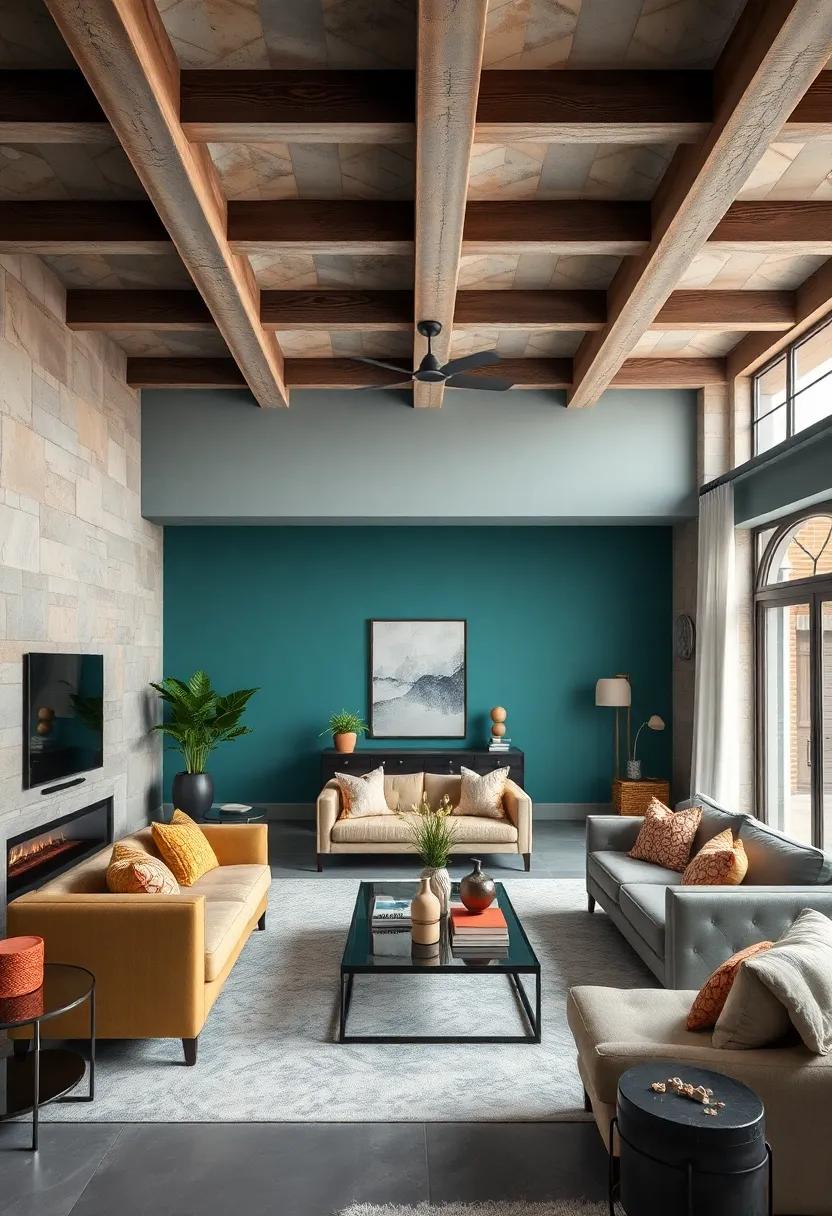 An Eye-Catching Ceiling Treatment: Consider painting beams or ceiling elements in bright turquoise to draw the eye upward and enhance the industrial character
