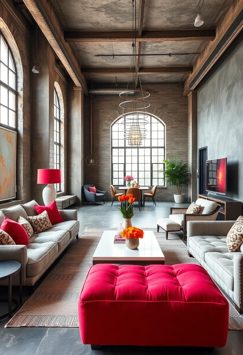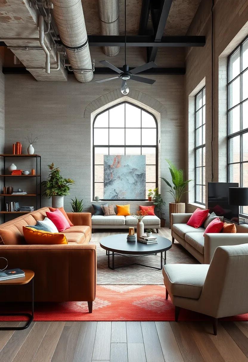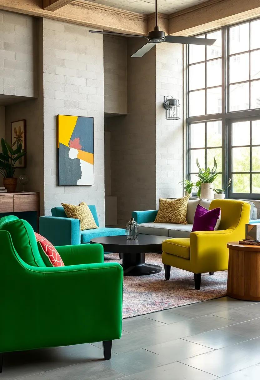 Transform your industrial living room into a vibrant sanctuary by incorporating accent chairs in striking colors like emerald green or royal purple. These bold hues create a stunning contrast against the typical neutral tones of exposed brick and weathered wood, instantly drawing the eye and adding visual intrigue.When selecting your accent chairs, consider fabrics that enhance their impact – a velvet finish will not only amplify the richness of the color but also add a touch of luxury. The interplay of textures within your space can elevate its aesthetic, making those chairs not just furniture pieces, but artful statements.