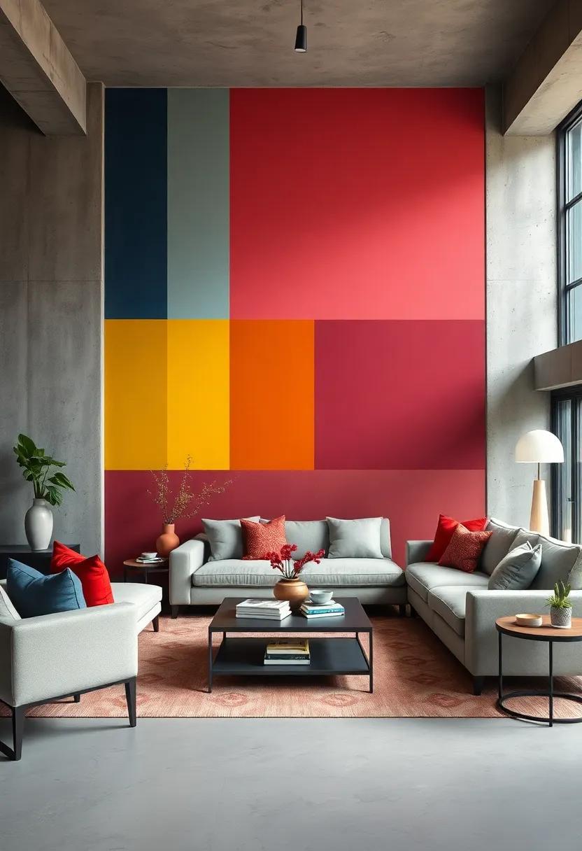 Multi-Hued Accent Wall: Use paint to create multi-colored panels on one wall, reflecting a modern palette that contrasts nicely with concrete elements