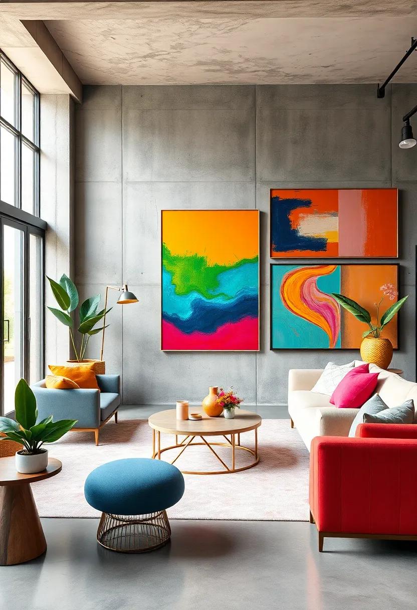 A Gallery Wall of Bright Art: Fill an industrial space with large, colorful artwork that stands out against polished concrete walls, inviting an eclectic and lively atmosphere