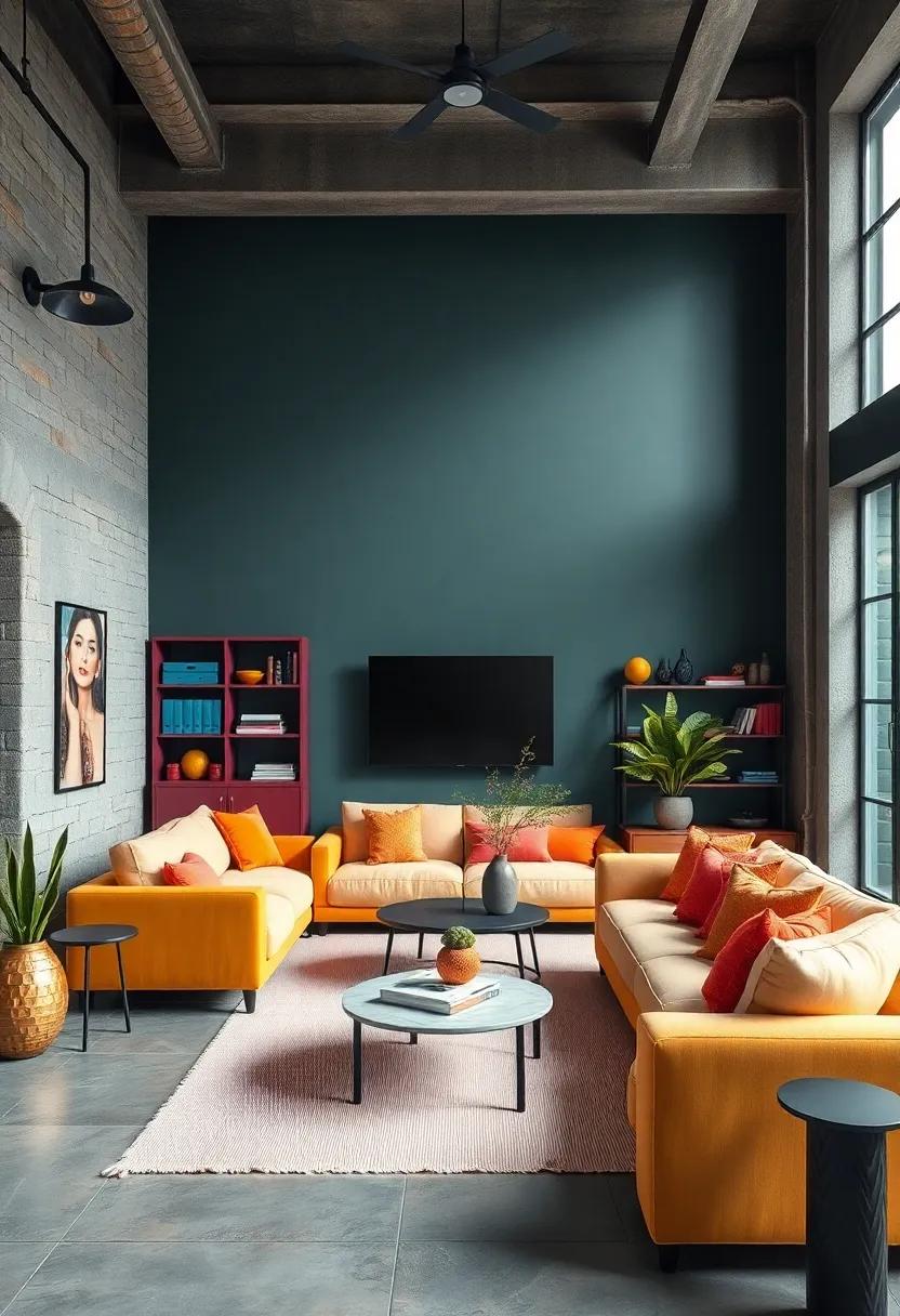 Experiment with combinations that excite you-perhaps using bold jewel tones to complement the neutral backdrop of an industrial space. Think of a deep emerald green accent wall contrasted with a sleek metallic coffee table, or a warm mustard yellow rug over a cool gray floor. This integration of color can be achieved through various elements such as cushions, artwork, or even large statement pieces like a colorful mural. Here are some ideas to get you started: