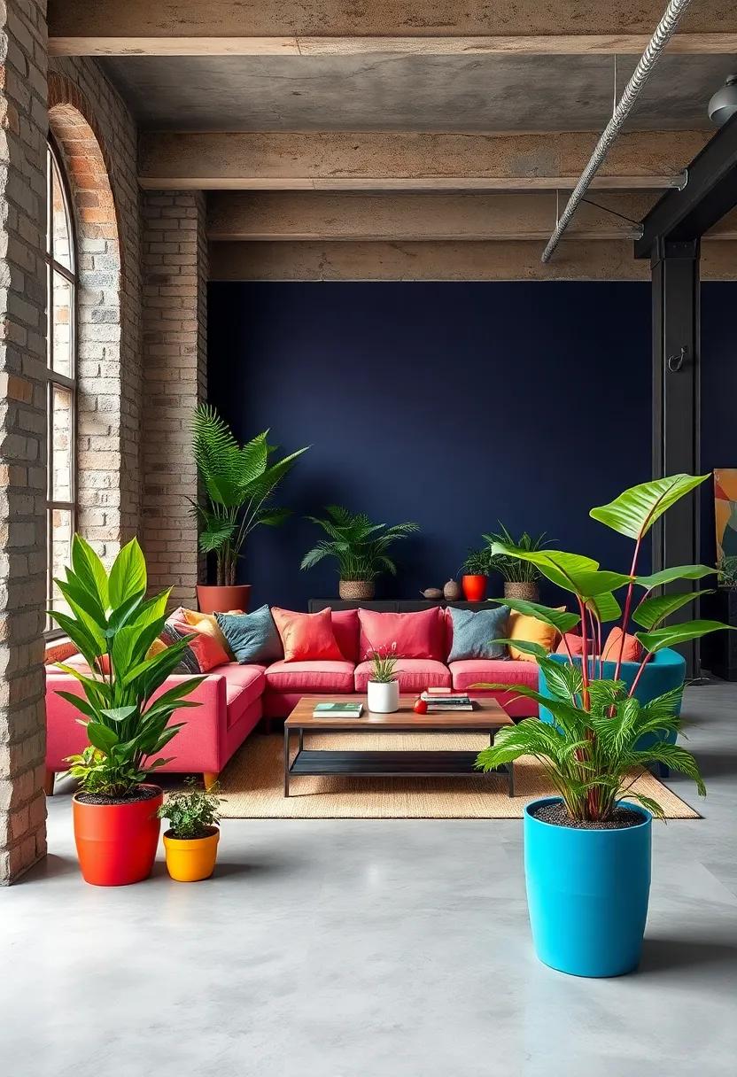 Vibrant Plant Life: Integrate lush greenery in pots painted bright colors, bringing life and freshness to the industrial look, harmonizing the raw with the organic