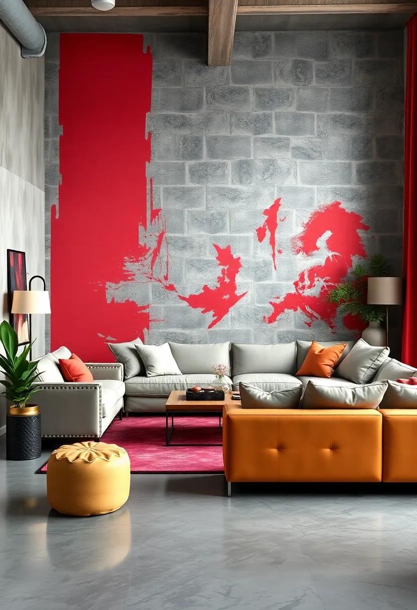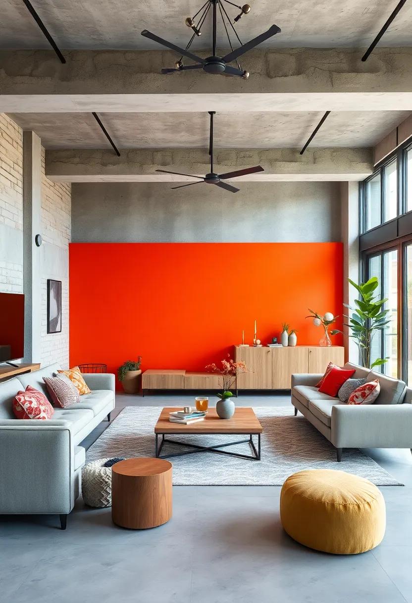 Transform the ambiance of your industrial living room with a striking accent wall that features a playful mix of colors. By employing a variety of paint shades, you can design multi-colored panels that not only add depth but also seamlessly contrast with the raw textures of concrete elements. Some vibrant color combinations to consider include: