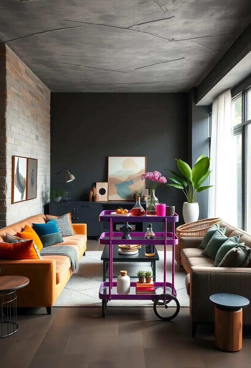 Transform your living space by introducing a vintage-inspired bar cart that bursts with character and color. Picture a bold turquoise or a vibrant mustard yellow cart, its sleek metal lines contrasting beautifully with rich hardwood floors or exposed brick walls. This functional piece not only serves as a stylish home for your favorite beverages and glassware but also acts as a standout feature in your industrial living room,sparking intriguing conversations. Pair it with some eclectic barware and statement glassware to enhance its eye-catching appeal.