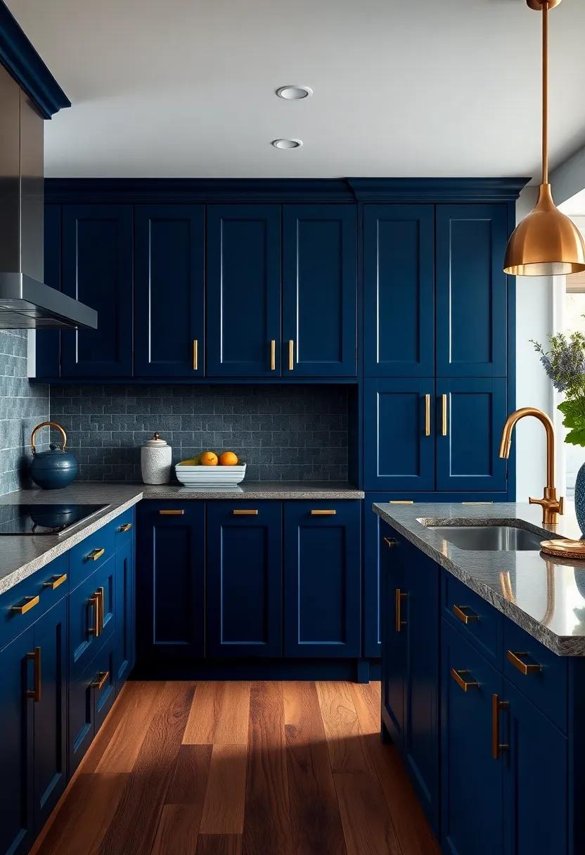 Embrace the Bold: A deep navy blue with gold handles creates a striking contrast, perfect for a dramatic kitchen overhaul