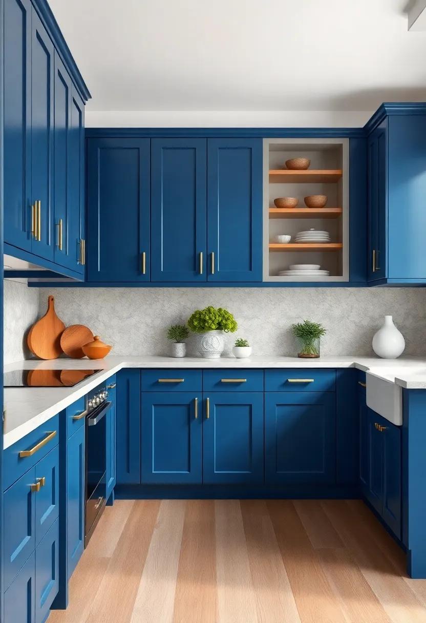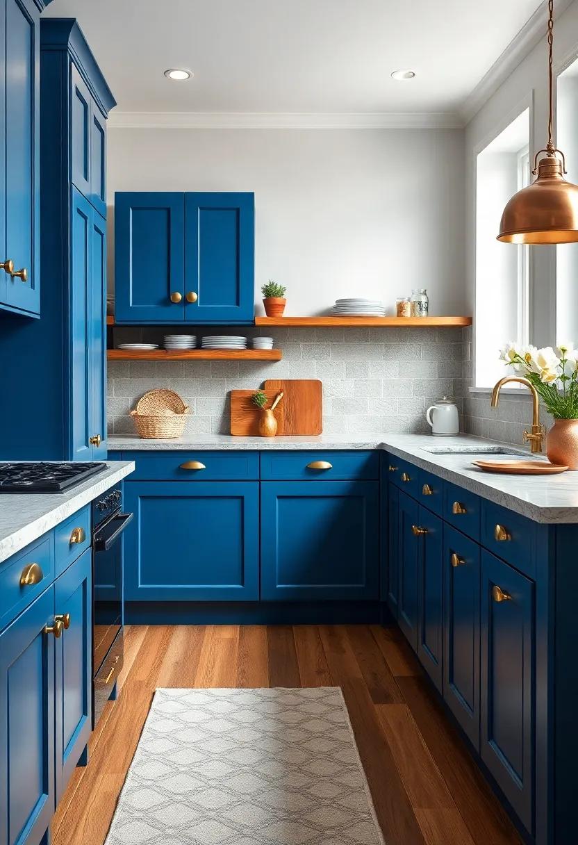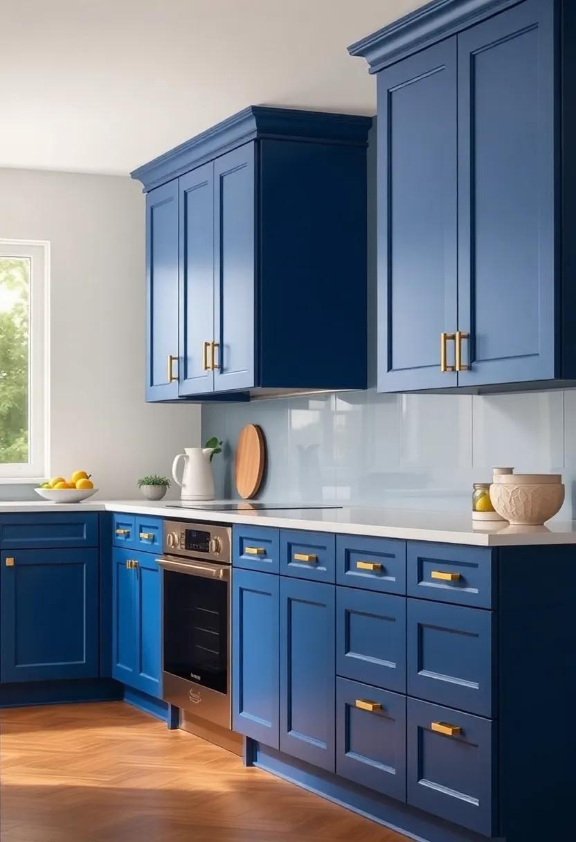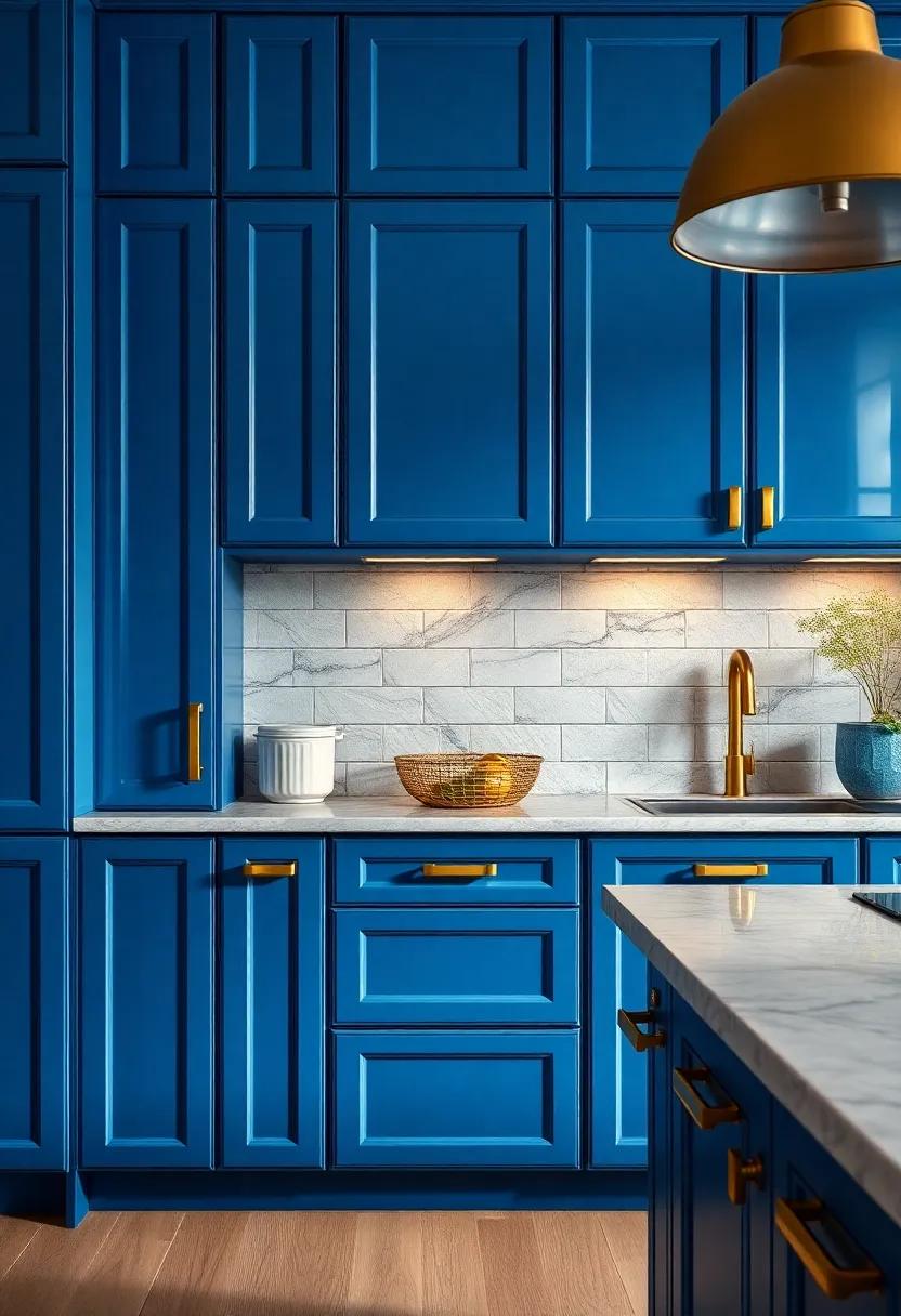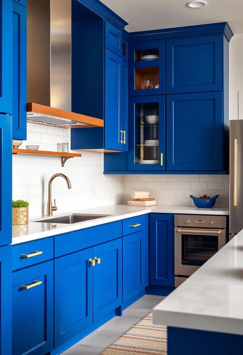 Imagine stepping into a kitchen where cobalt blue cabinets command attention against a backdrop of pristine white walls. This striking contrast not only enhances the visual appeal but also creates a tranquil atmosphere that invites creativity and joy into your cooking space. To elevate the look further, consider integrating gold handles that glisten like sunlit jewels, drawing the eye and becoming instant focal points. The warmth of the gold sets off the coolness of the blue, establishing a harmonious balance that exudes elegance.