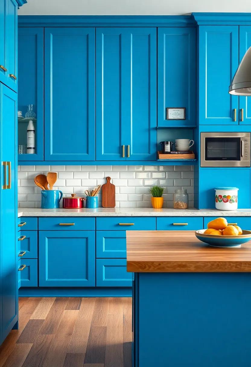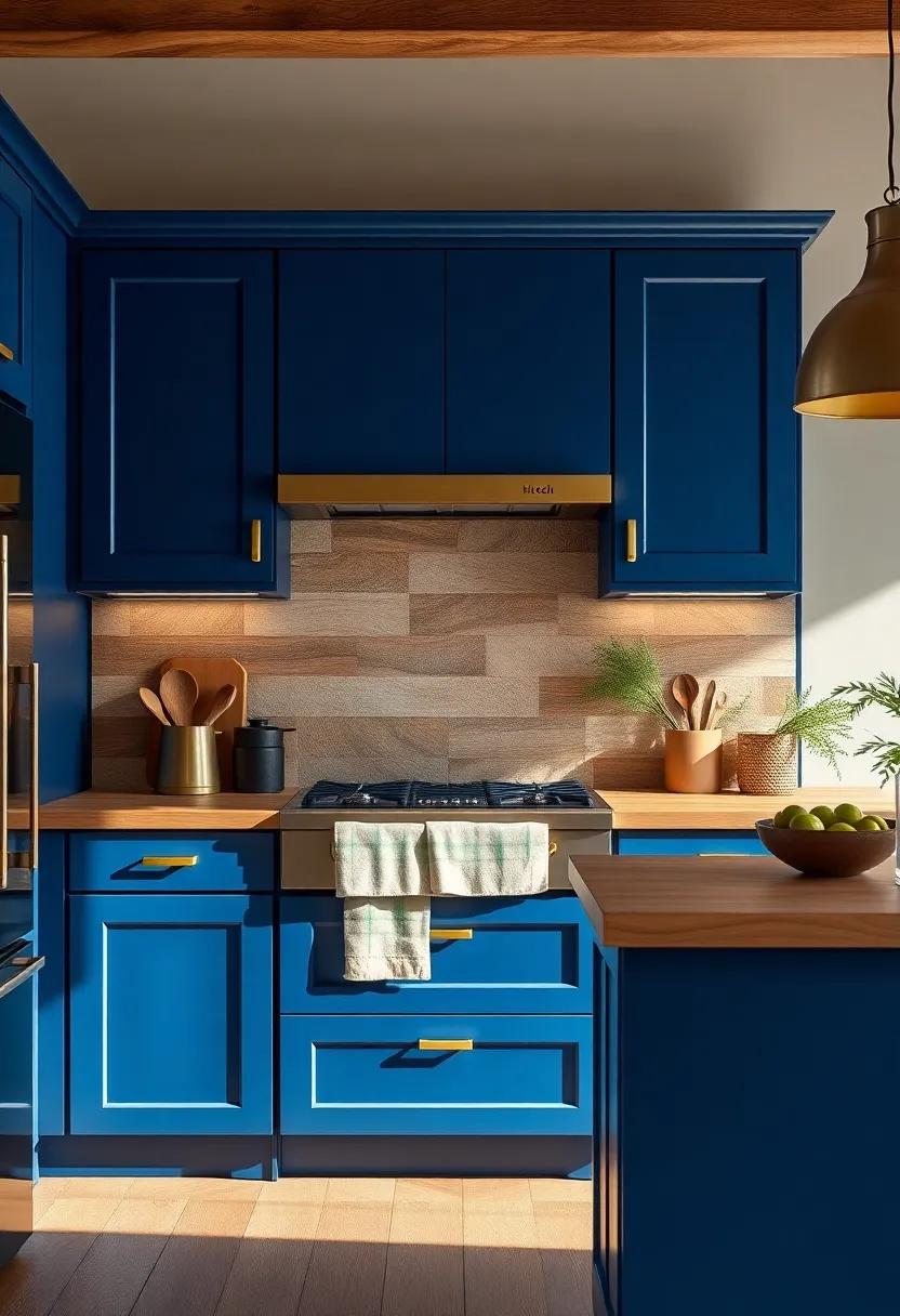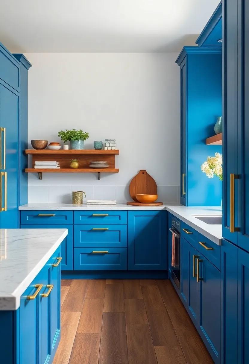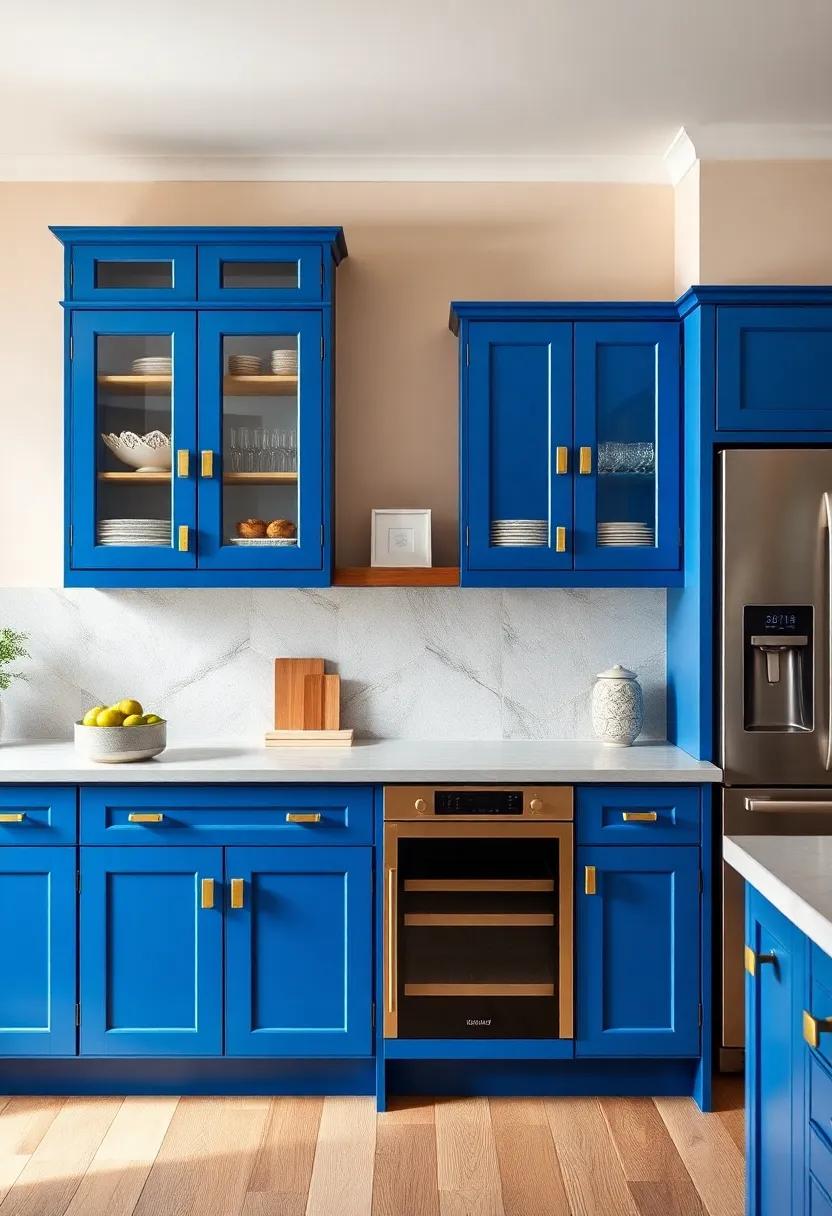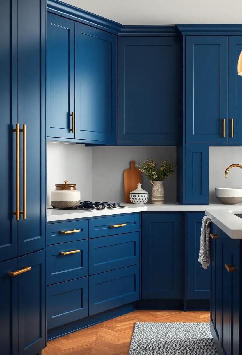 Imagine stepping into a kitchen where cobalt blue cabinets command attention against a backdrop of pristine white walls. This striking contrast not only enhances the visual appeal but also creates a tranquil atmosphere that invites creativity and joy into your cooking space. To elevate the look further, consider integrating gold handles that glisten like sunlit jewels, drawing the eye and becoming instant focal points. The warmth of the gold sets off the coolness of the blue, establishing a harmonious balance that exudes elegance.