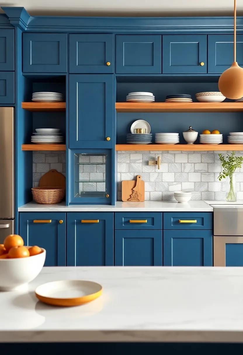 Consider strategic placement for your open shelves to ensure they harmoniously complement the blue cabinetry. By selecting a rich, contrasting hue for your dishware—like white, soft pastels, or even metallic touches—you can create a balanced aesthetic that stands out against the cabinetry. Here’s a simple layout idea: