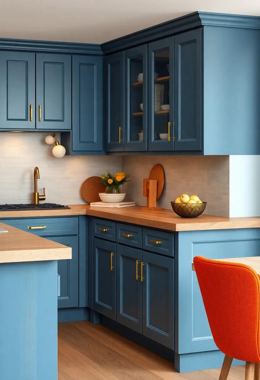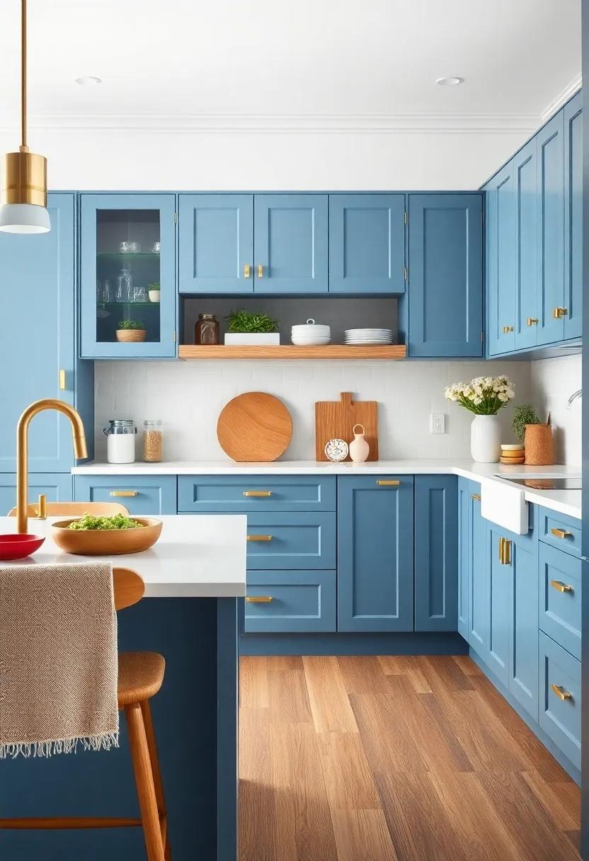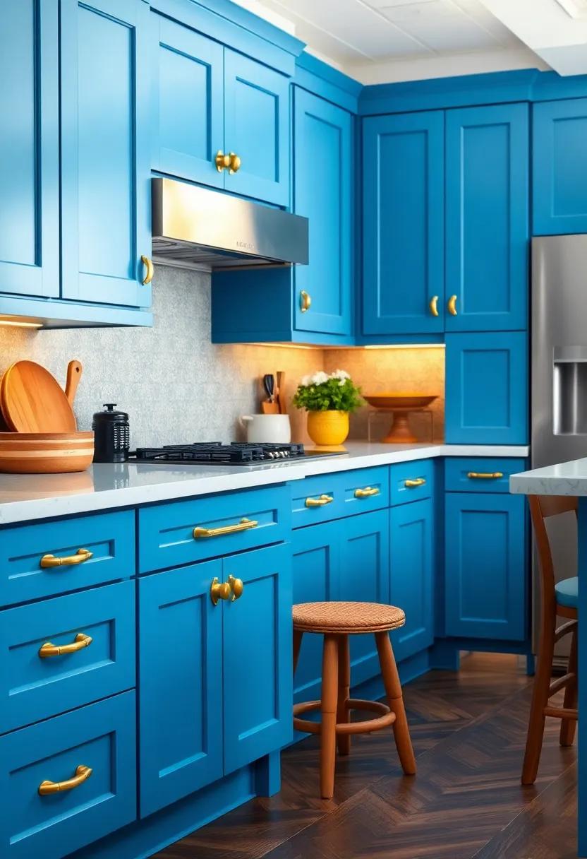 Culinary Canvas: Use blue cabinets as a backdrop for colorful kitchen appliances, letting the gold handles serve as stylish accents