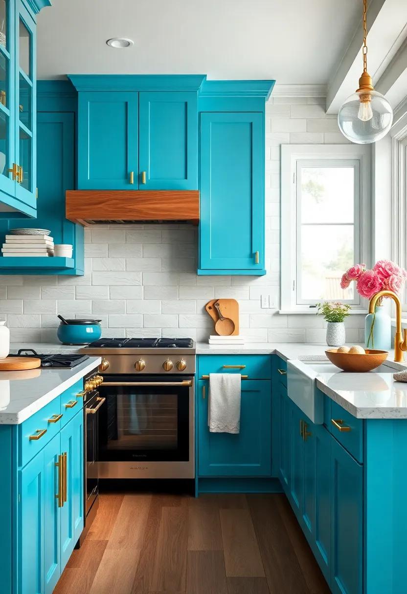Coastal Charm: Incorporate a vibrant turquoise with golden hardware for a beach-inspired kitchen that feels like vacation every day
