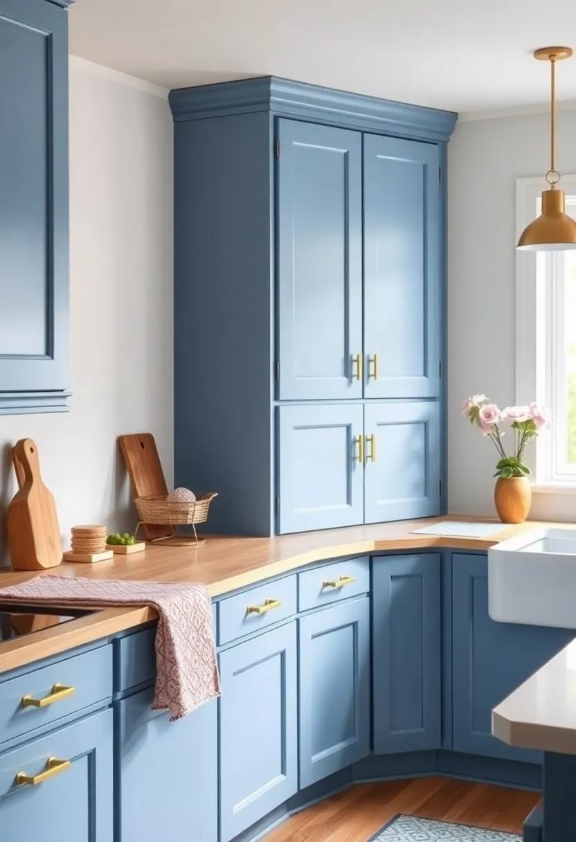 Farmhouse Flair: Integrate soft, farmhouse-style blue cabinets with vintage-style gold handles for a welcoming and warm kitchen environment