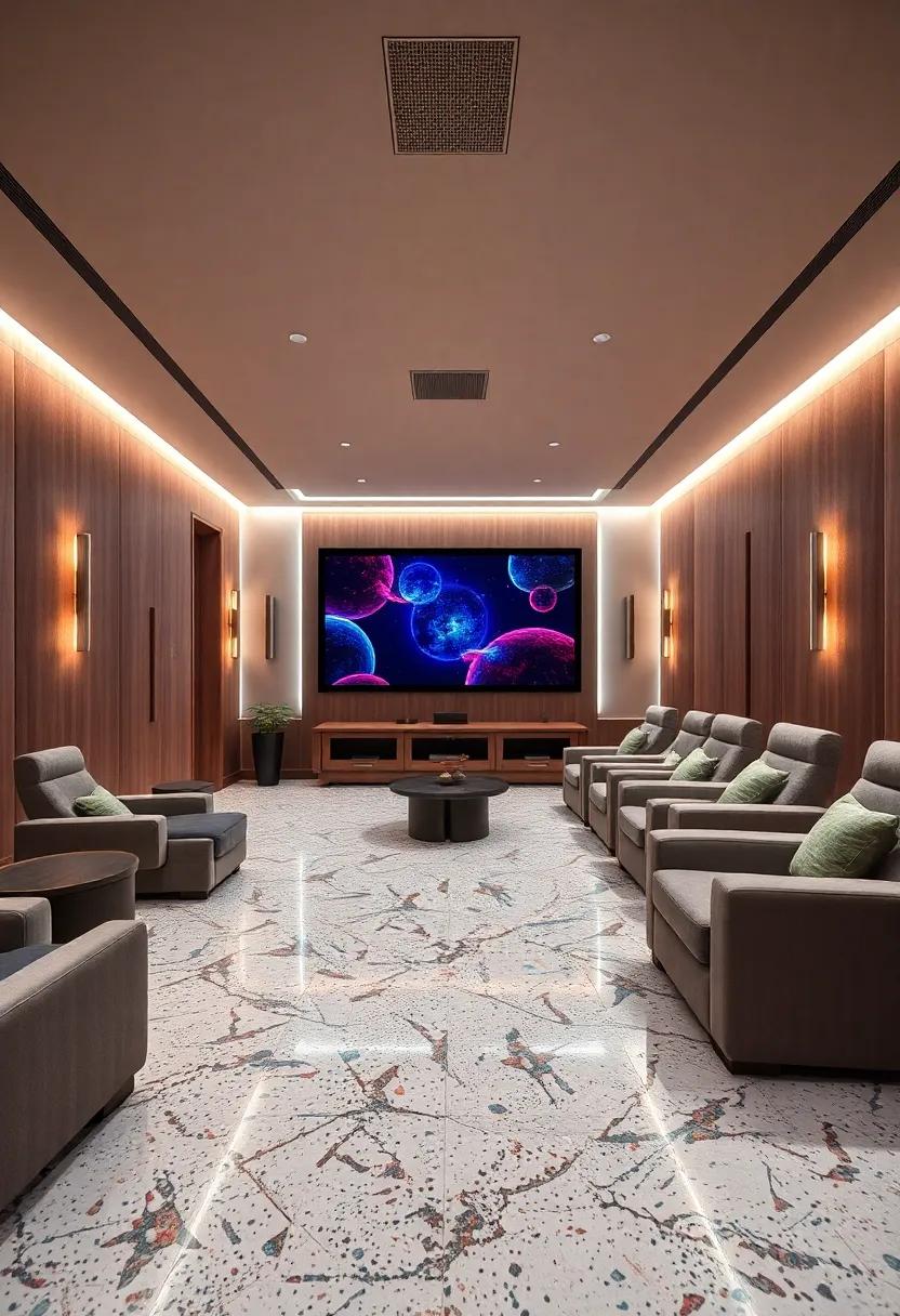 Revel in a luxurious home theater where a shimmering terrazzo floor creates an inviting path to plush, comfortable seating, ensuring every cinematic experience is nothing short of spectacular