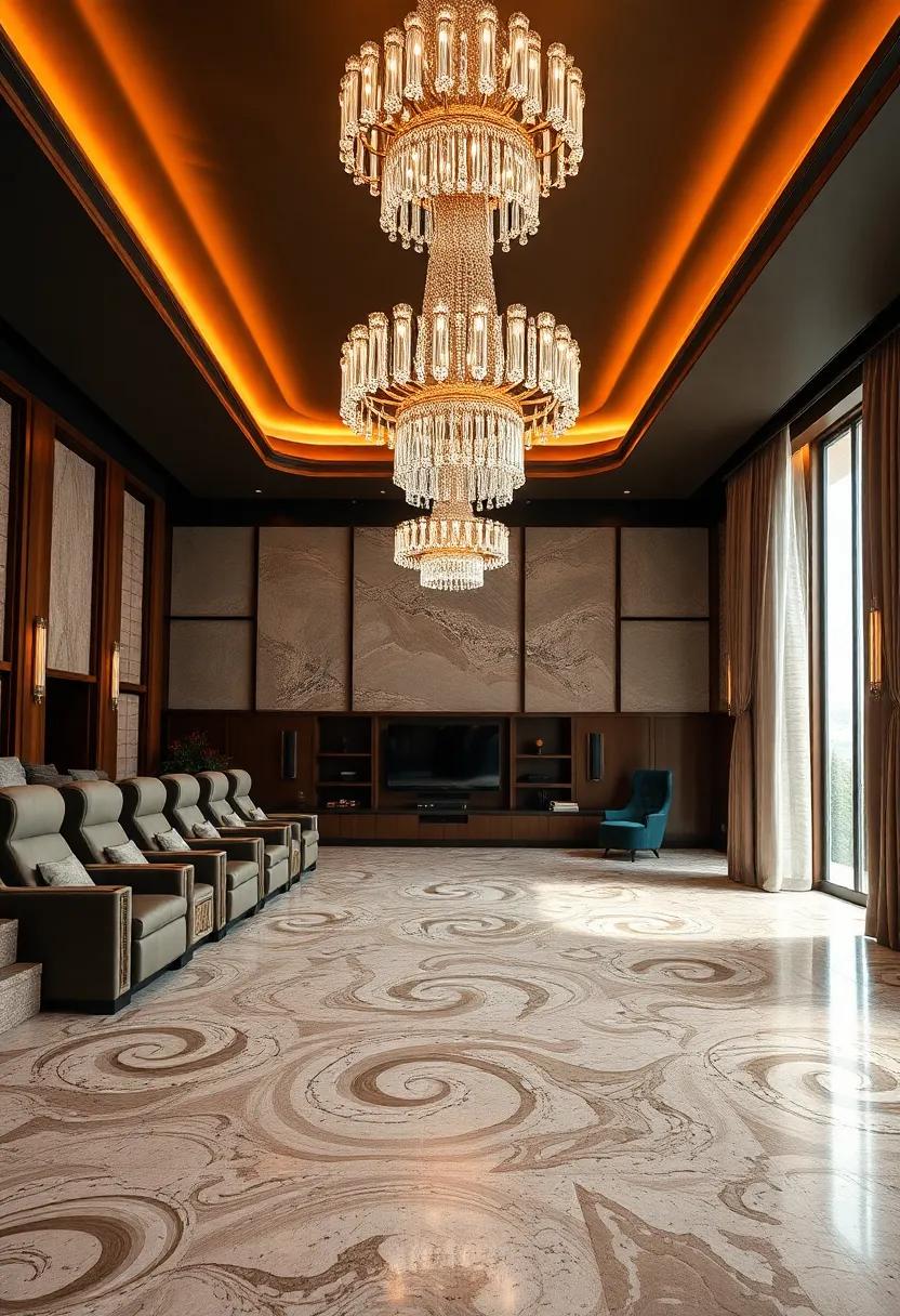 Marvel at an opulent design featuring luxurious crystal chandeliers above a beautifully detailed terrazzo floor that showcases swirling patterns, elevating the aesthetic of this grand home theater