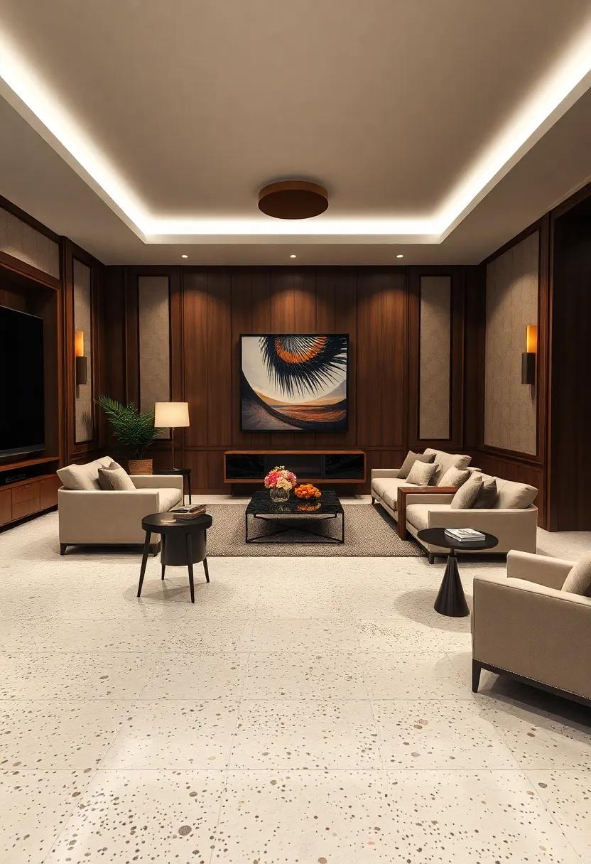 - Ambient lighting: Design elements like cove lighting in conjunction with the reflective surface of terrazzo enhance the atmosphere, setting the perfect mood for movie night.