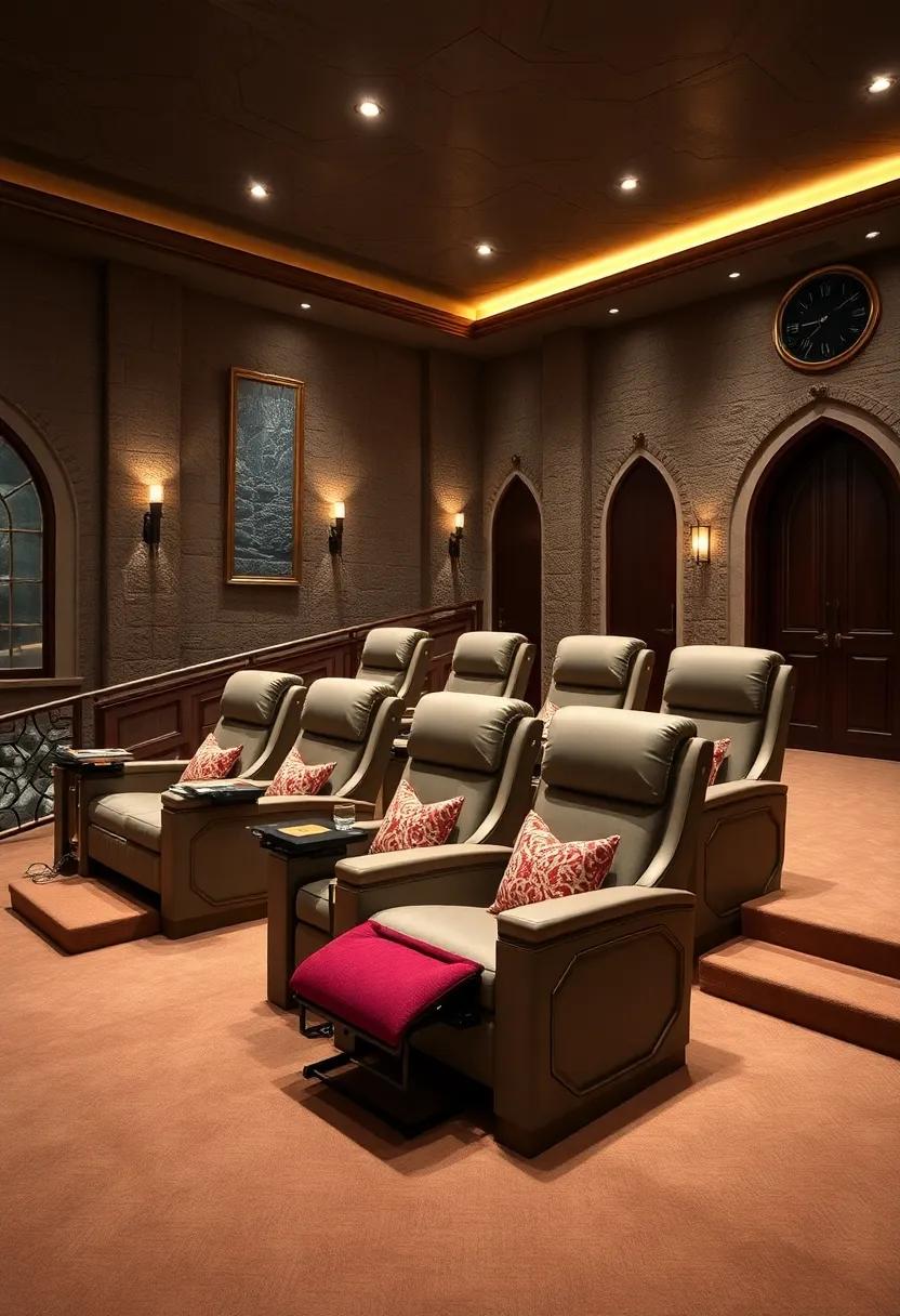 Feel like royalty in a European castle-themed home theater featuring ornate chairs with reclining abilities and richly appointed fabrics,ensuring each movie night is a royal affair