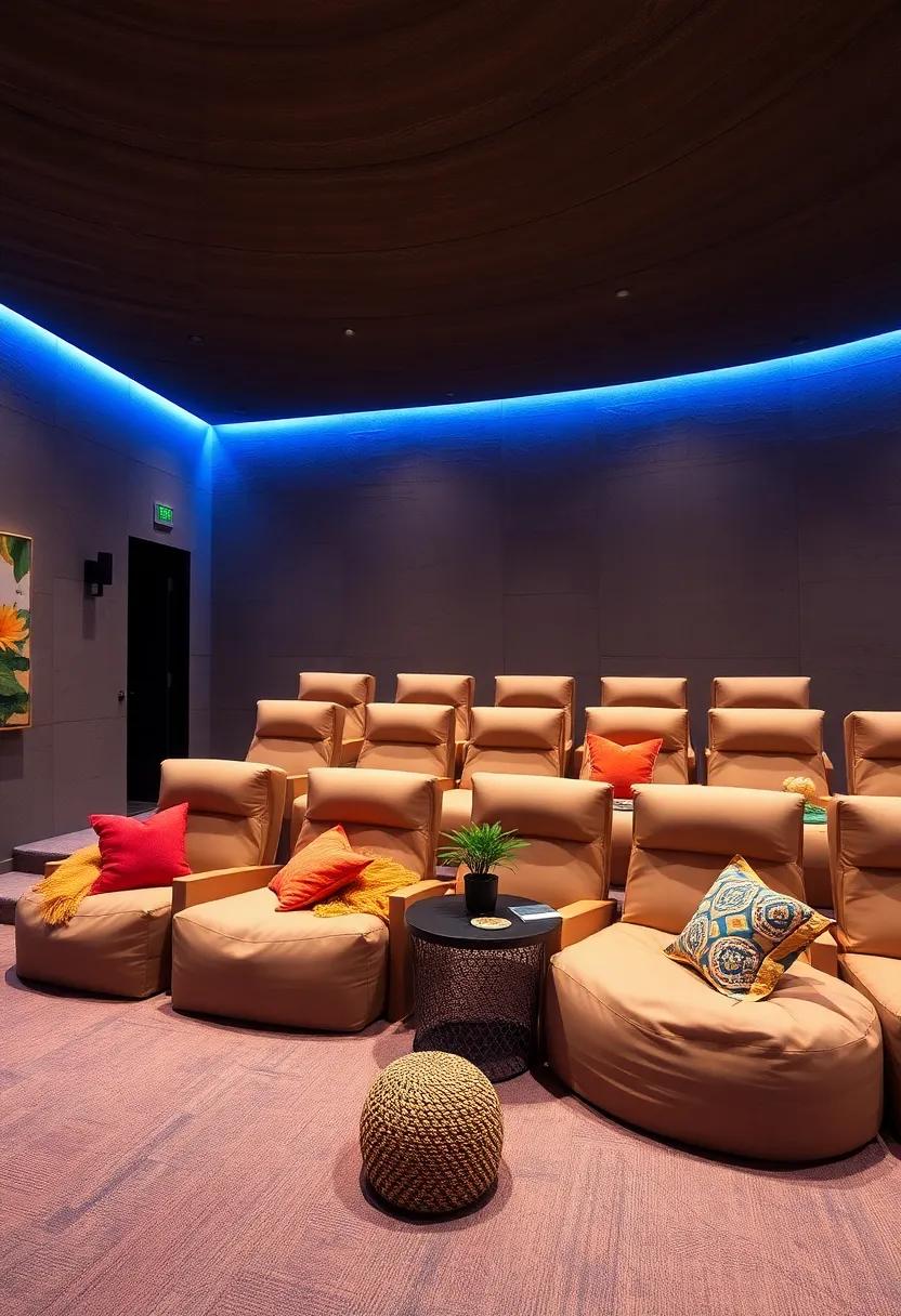 Get cozy in a bohemian-style home theater where bean bag reclining seats create a laid-back atmosphere,perfect for movie marathons with friends and family