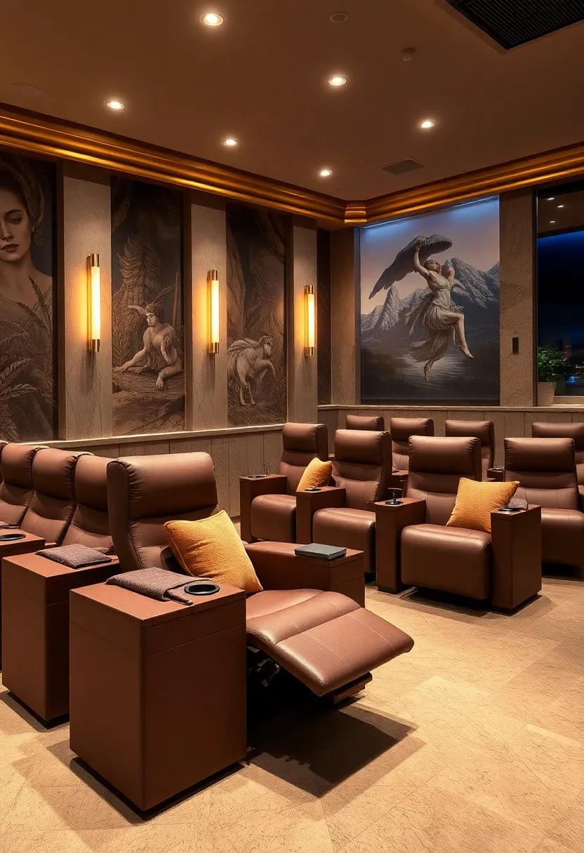 Discover an art deco home theater adorned with stunning murals and gold accents, offering cushy recliners that invite you to relax in style while enjoying your favorite flicks
