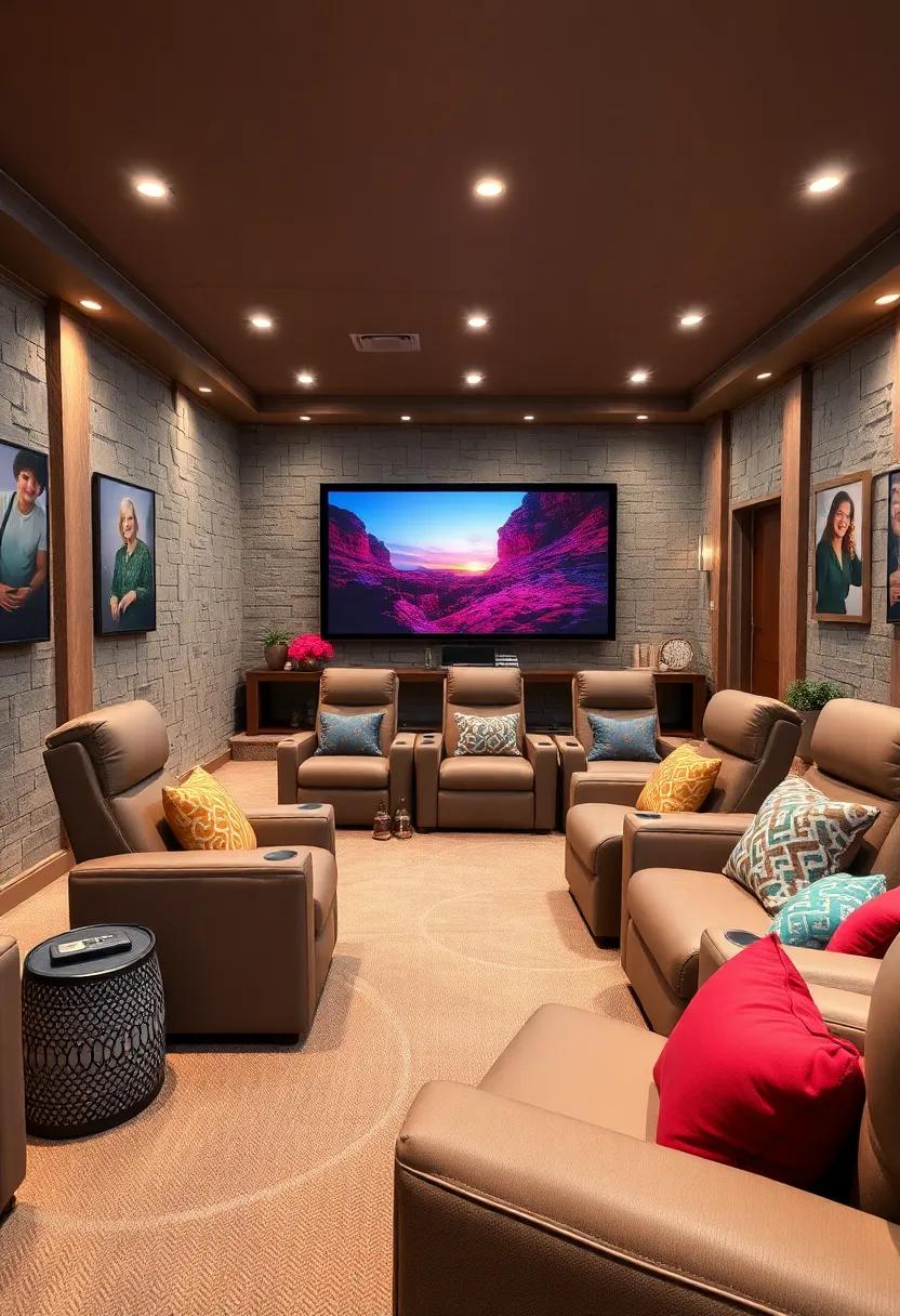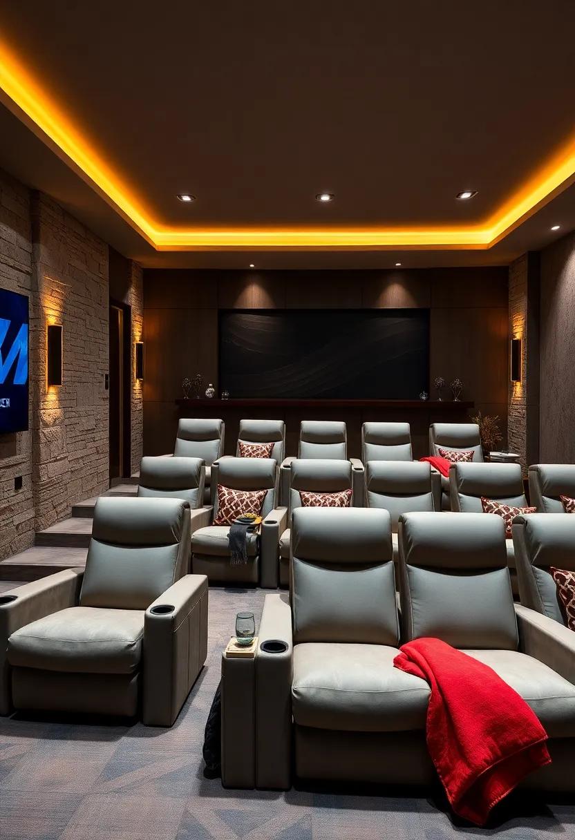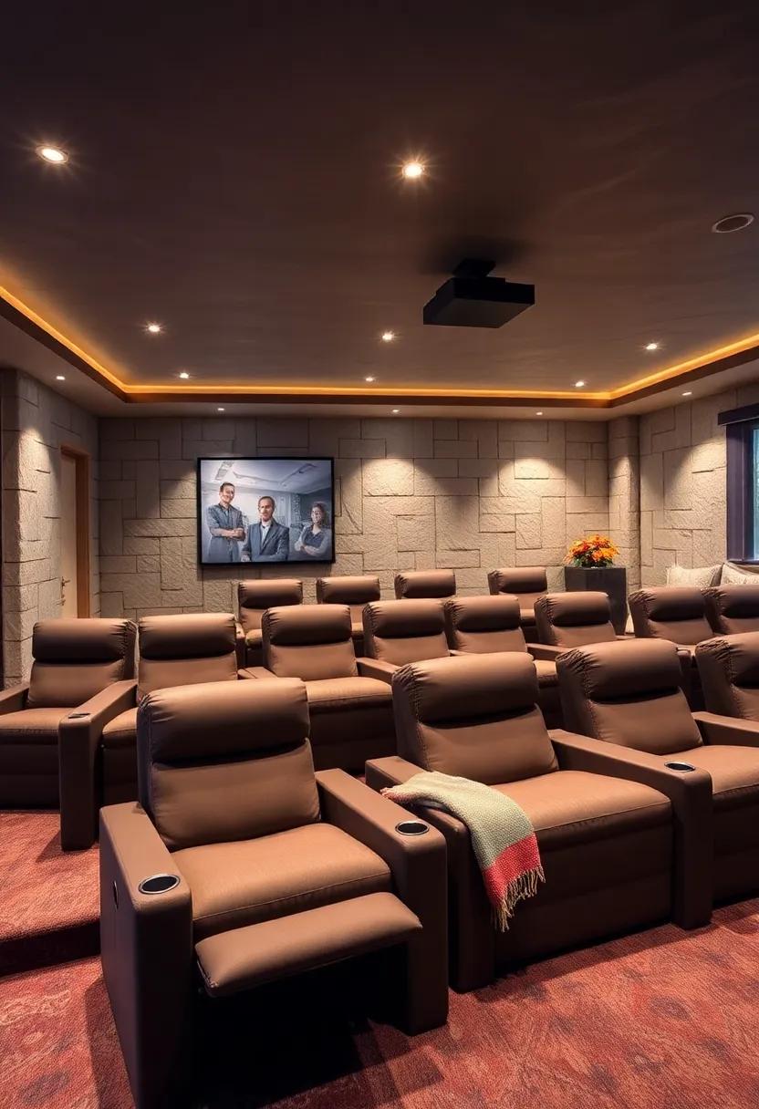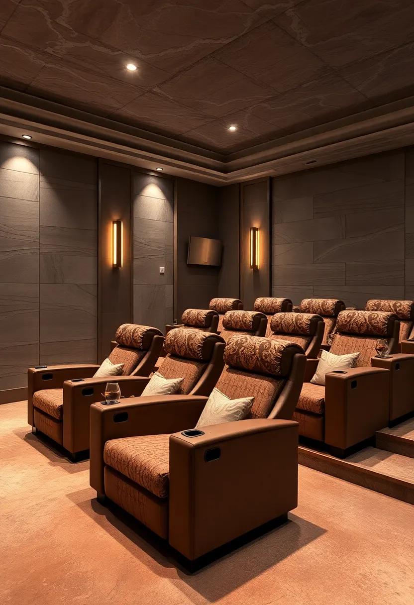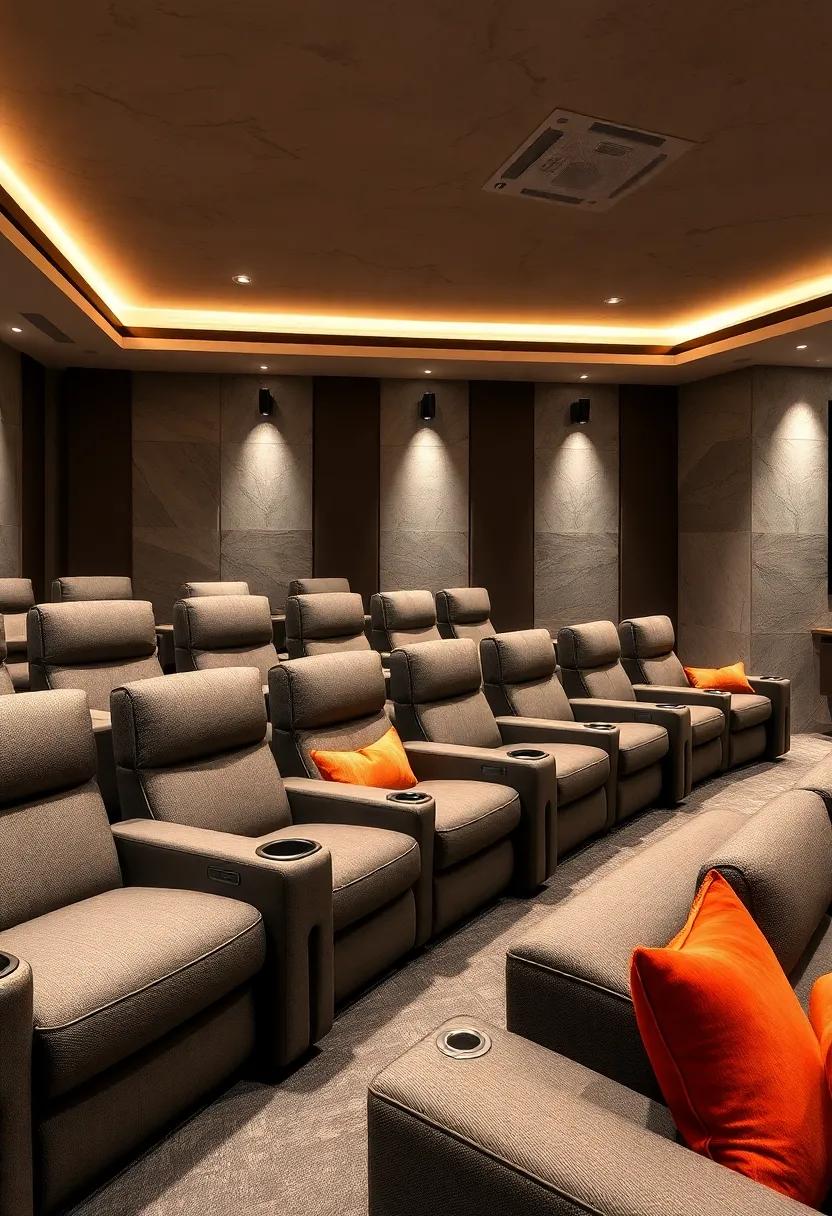Transform your viewing experience in a home theater with plush recliners featuring built-in massagers and cup holders, allowing you to truly kick back while watching the latest blockbusters