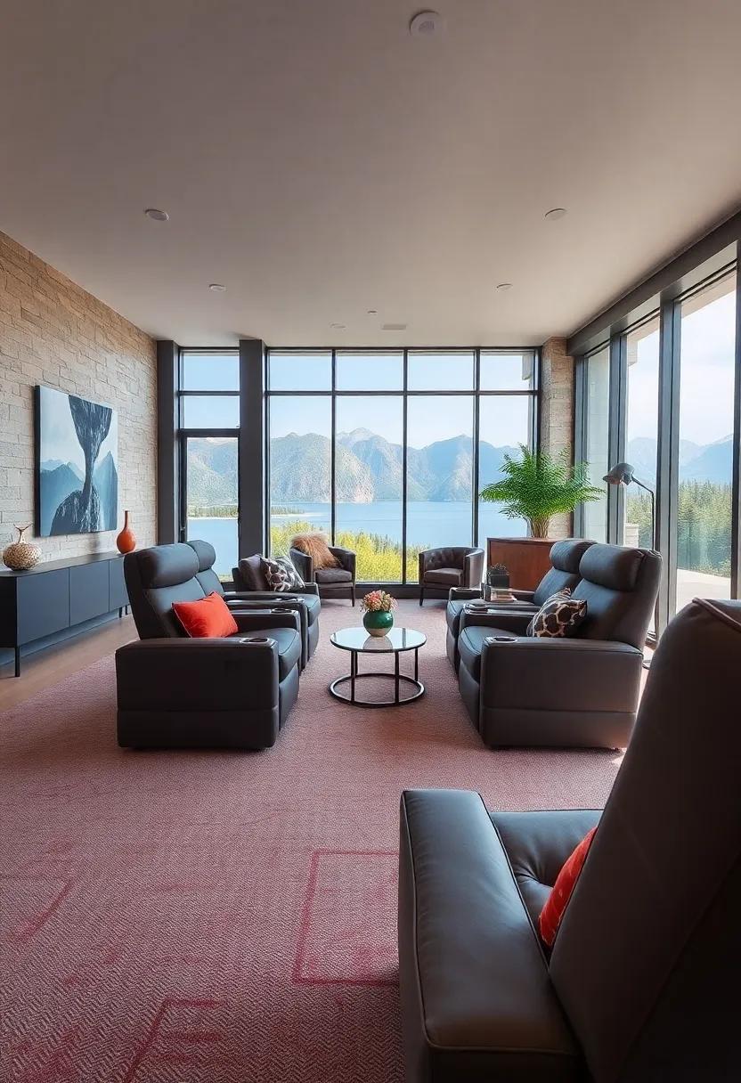 Imagine sinking into plush recliners that provide not only comfort but also a meticulously curated view of your surroundings.In a home theater designed with large windows, the natural light transforms the space, blending indoor relaxation with the breathtaking beauty of the outdoors. Strategically placing seating to maximize views allows movie lovers to enjoy both cinematic adventures and the scenic allure outside. This harmonious integration creates a unique ambiance — where lush gardens, rolling hills, or tranquil water features become part of the viewing experience, enhancing the overall enjoyment.
