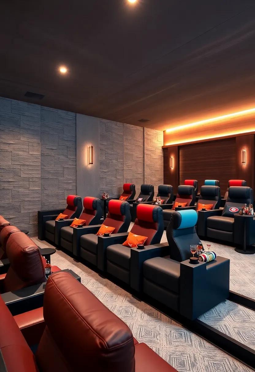 Get lost in a sports-themed home theater where reclining seats sport your favorite team colors, ensuring every game and movie experience is nothing short of electrifying