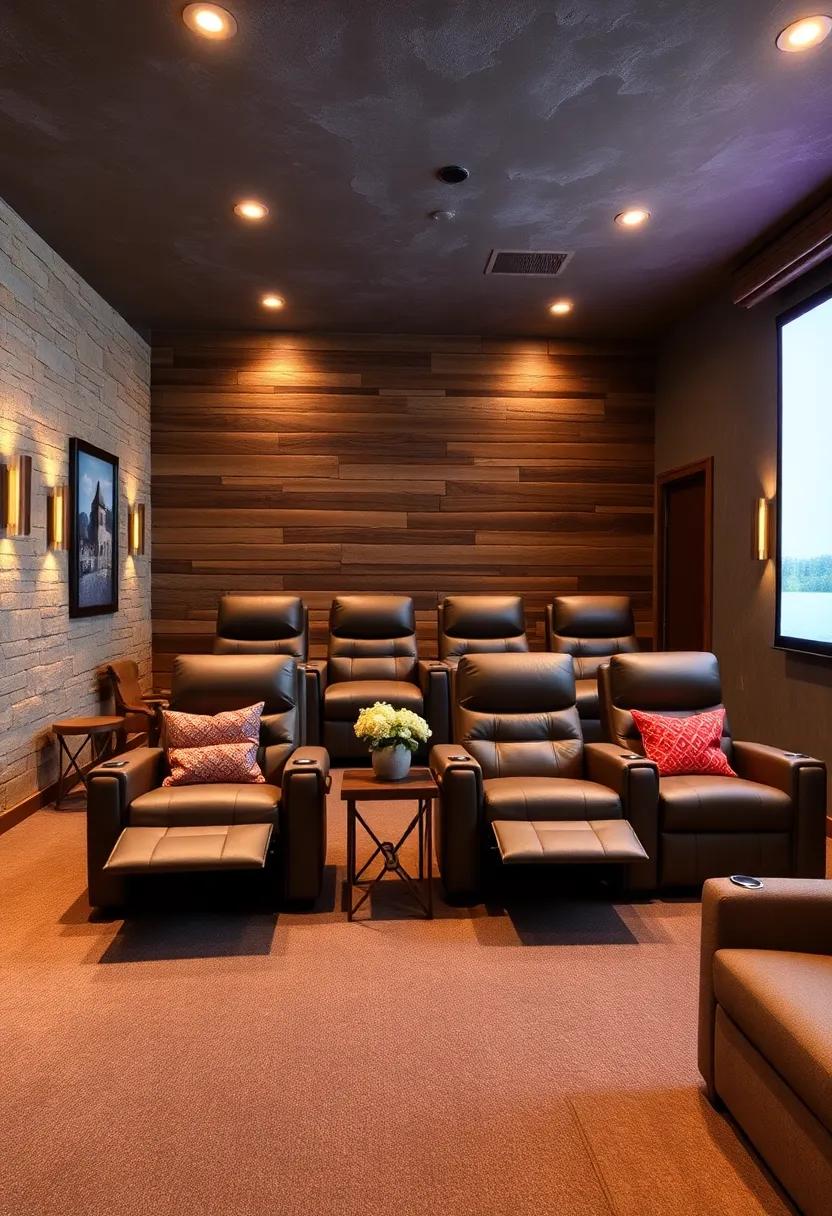 Step into a world of tranquility where your love for cinema melds with nature’s charm. Imagine a home theater that feels like an enchanting escape, featuring reclining chairs crafted from reclaimed wood, carefully selected to harmonize with the rustic aesthetic. Each piece tells a story, offering not only comfort but also a profound connection to the environment. With plush cushions and soft upholstery, you can easily sink in for the duration of your film, embraced by the warm hues and textures of wood that echo the serene beauty of a forest retreat.