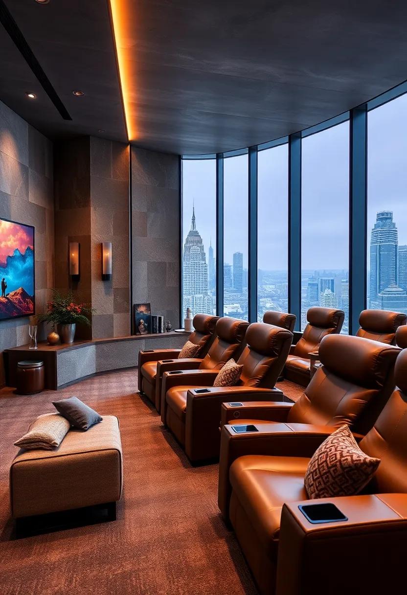 Savor a cinematic experience in a luxury home theater nestled within a modern skyscraper, featuring plush leather recliners and panoramic city views that make each film unforgettable
