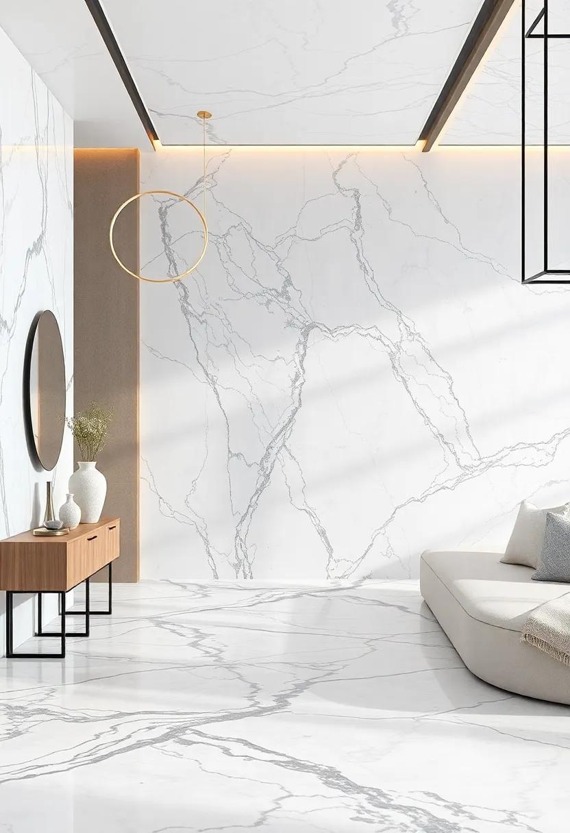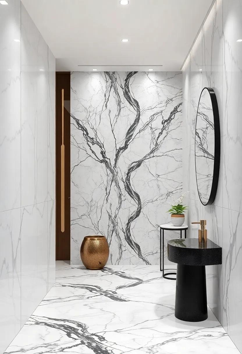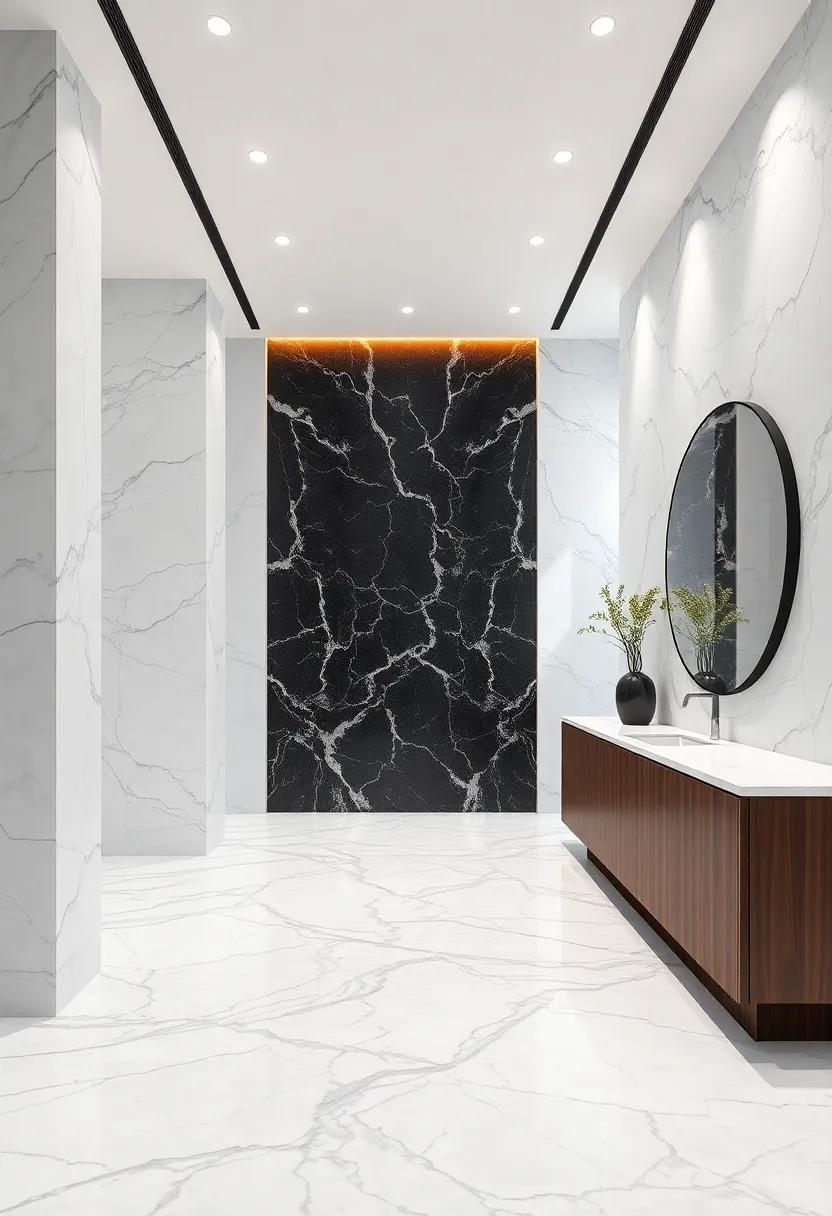 Bold Accent Walls: consider using marble flooring that flows into a striking accent wall, creating a stunning and cohesive look
