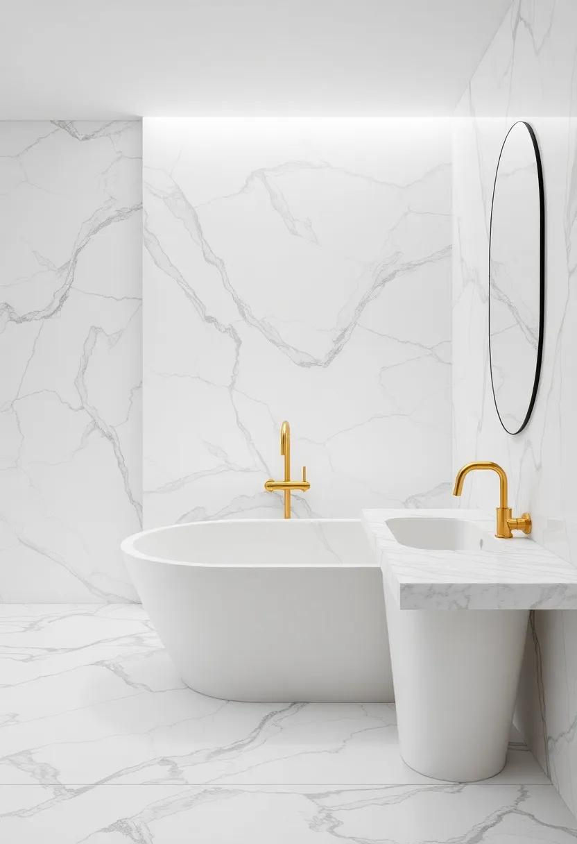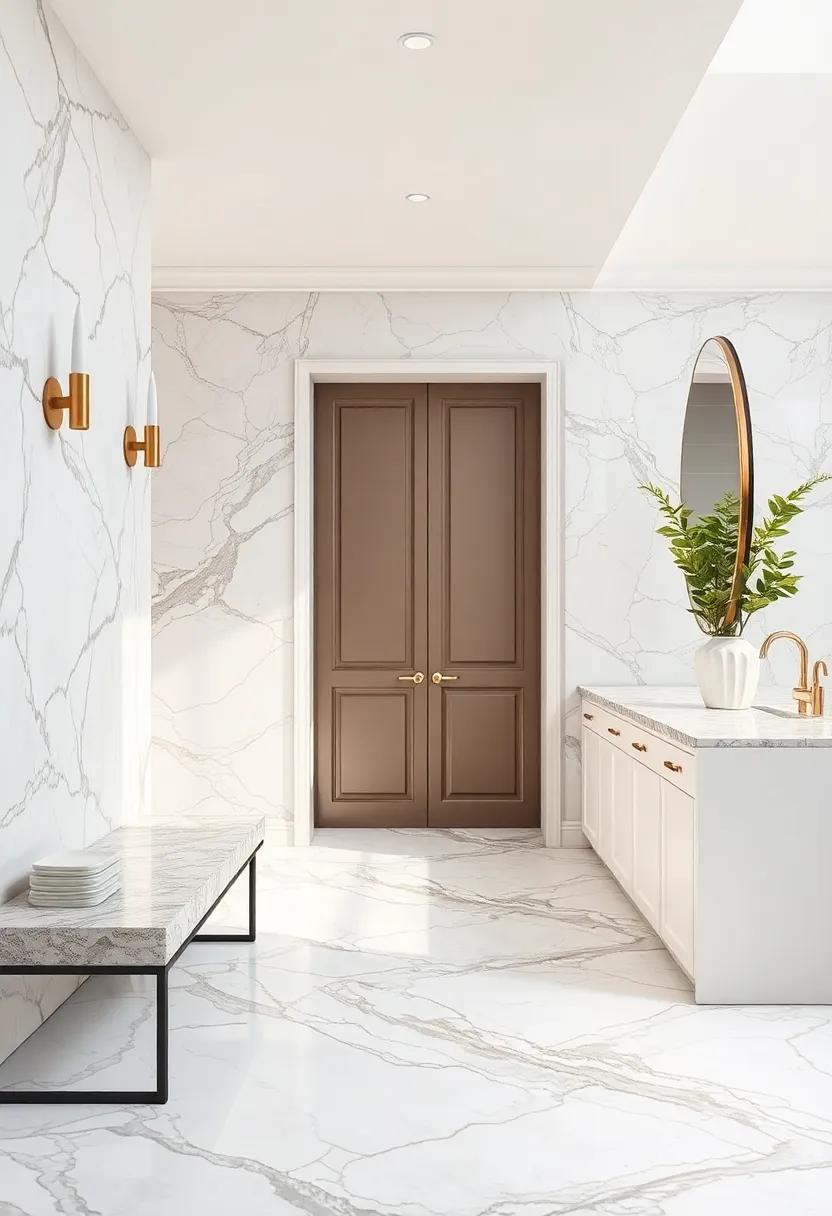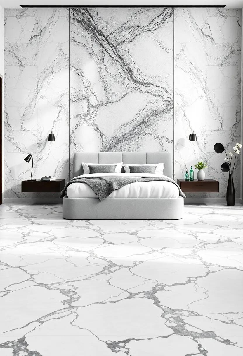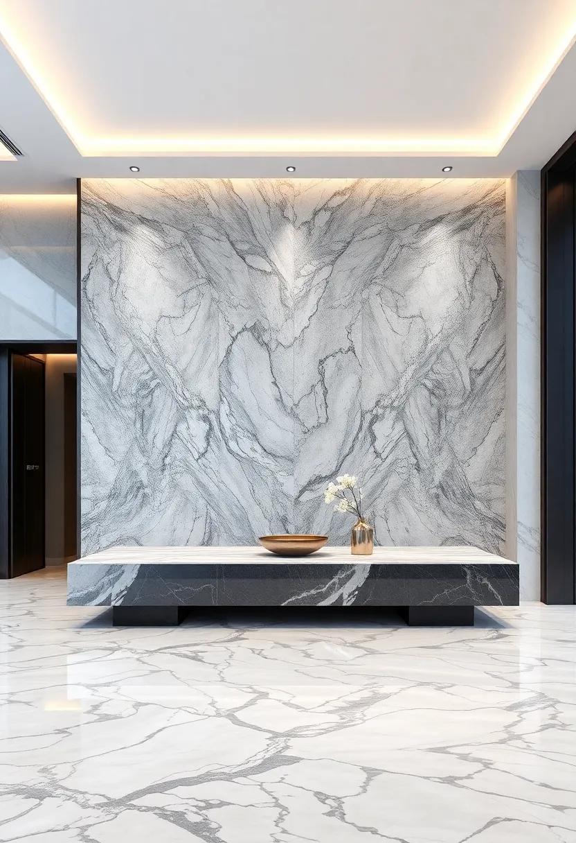 Bold Accent Walls: consider using marble flooring that flows into a striking accent wall, creating a stunning and cohesive look