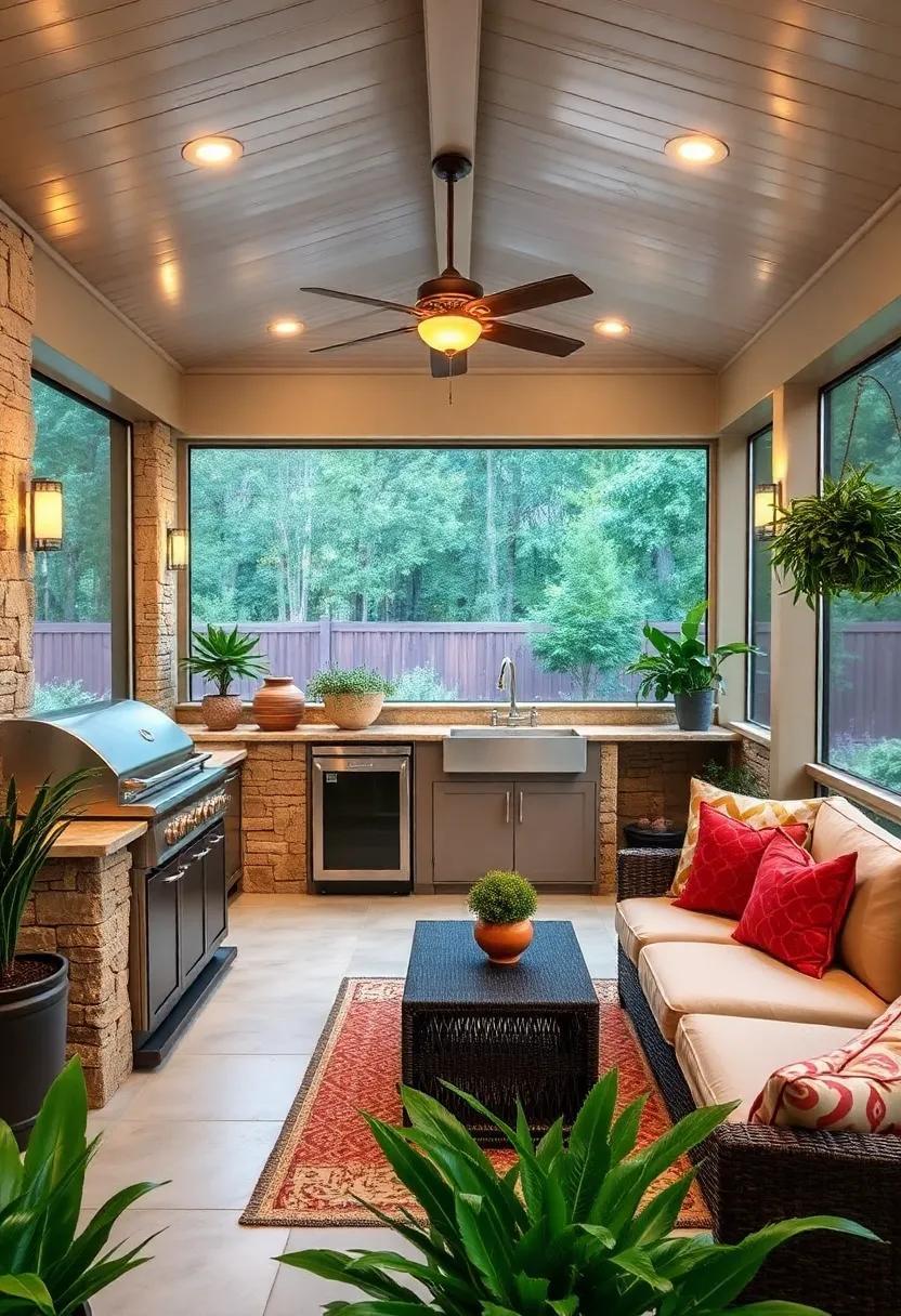 the beauty of a screened porch lies in its versatility, serving as a perfect transition from the indoors to the great outdoors. with the right lighting, consider adding pendant lights above the kitchen area for an inviting glow as the sun sets.Surround this chic setup with an array of potted plants or an herb garden to further enhance the experience-fresh ingredients just steps away from your culinary haven. The thoughtful integration of urban design into this outdoor space makes it not only a cooking area but also a sanctuary for relaxation and socializing, where style and function coexist effortlessly.