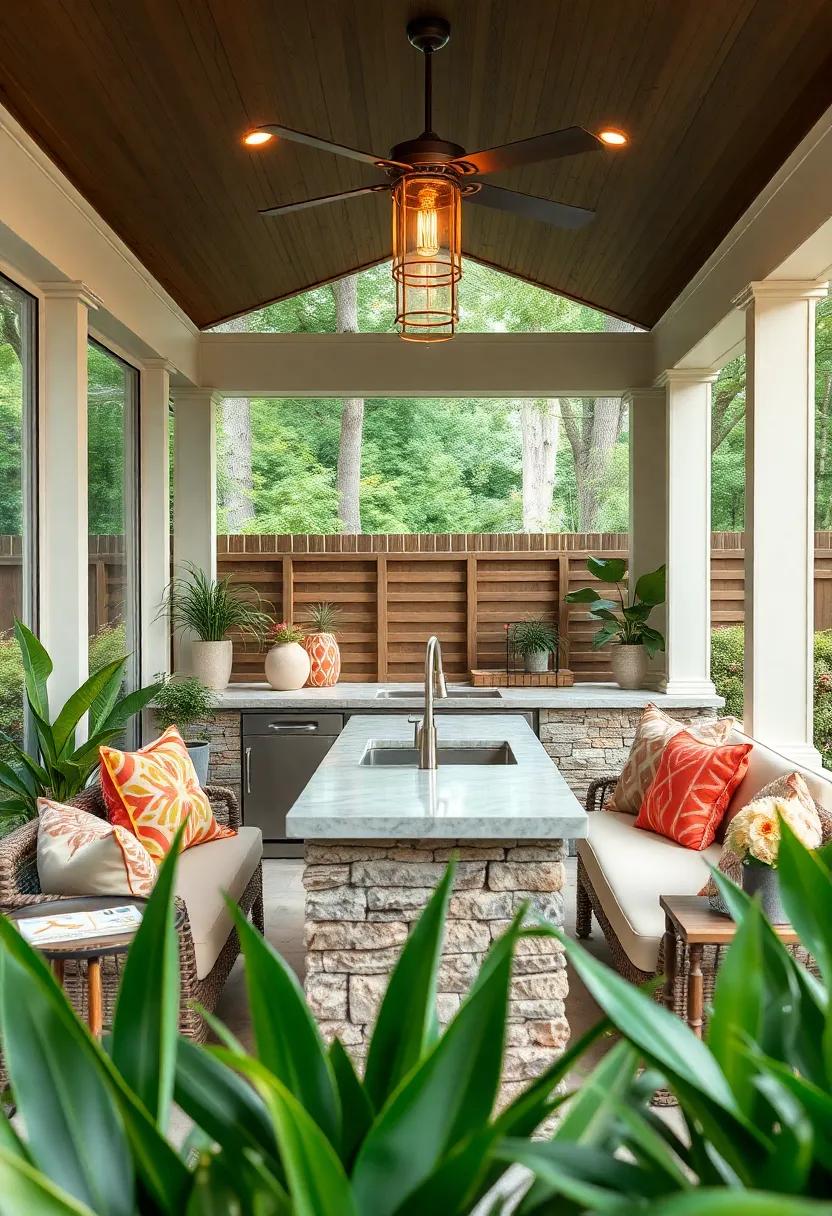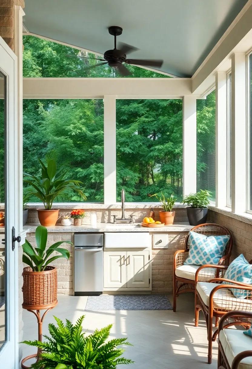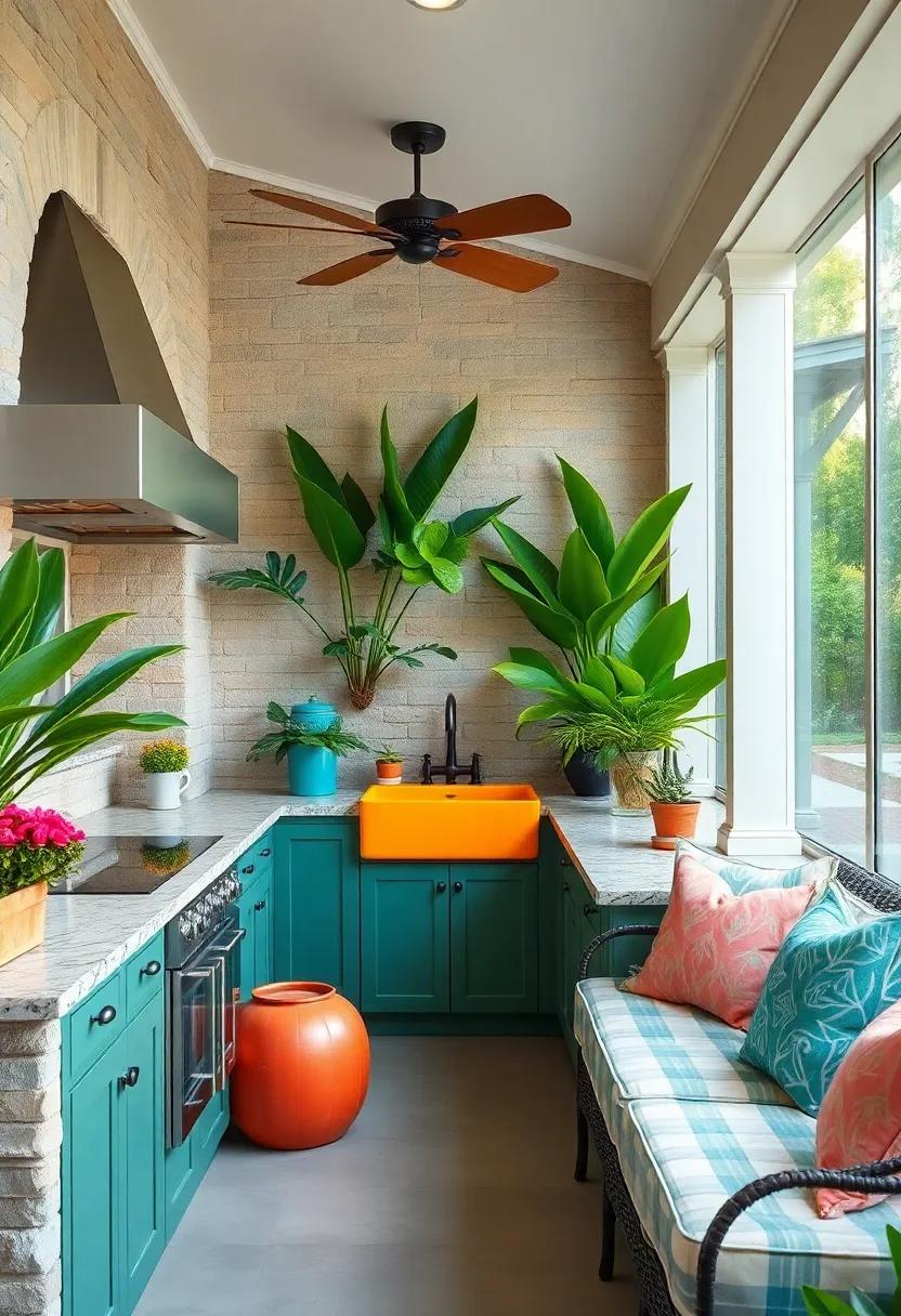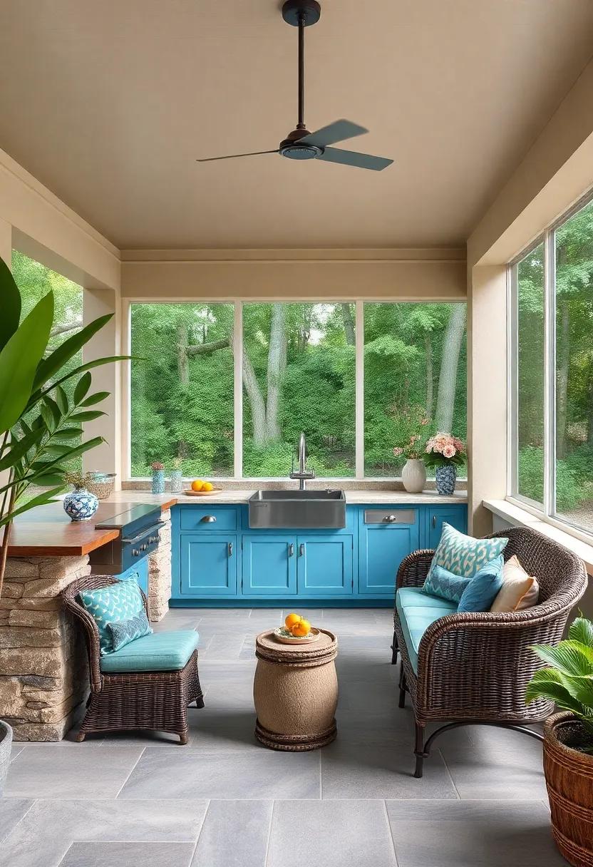 Consider a vibrant tropical theme for your screened porch kitchen,complete with a brightly colored sink and lush greenery,embracing a lively atmosphere perfect for casual gatherings