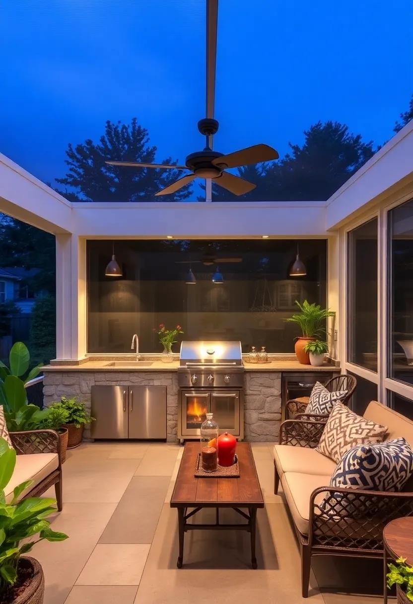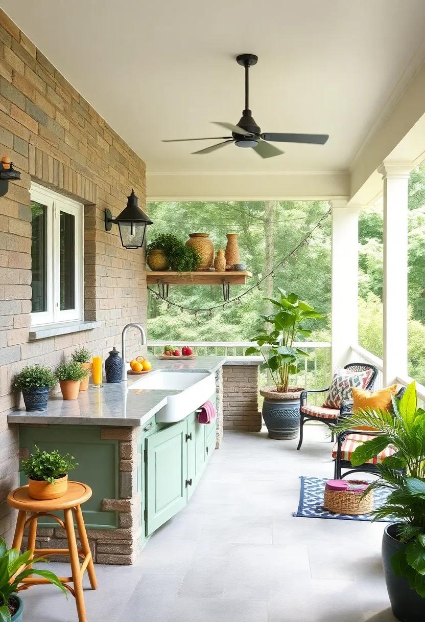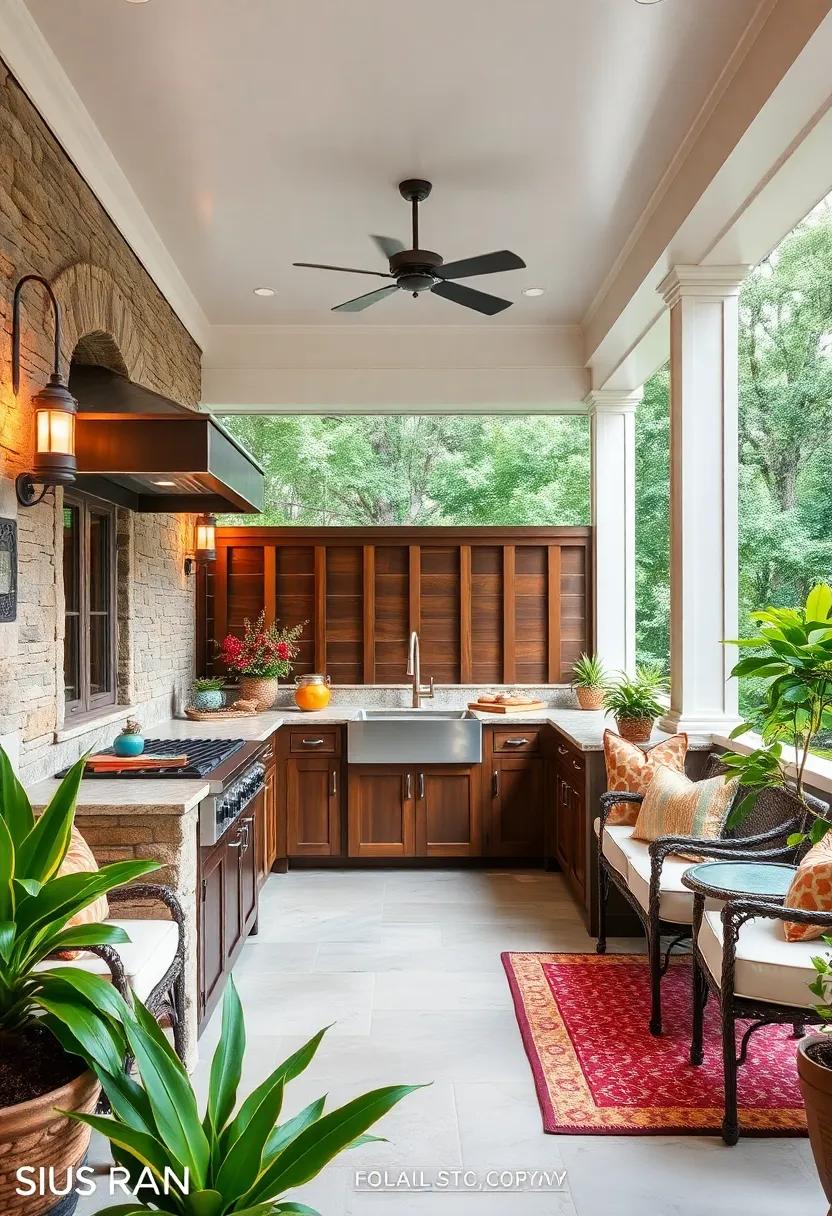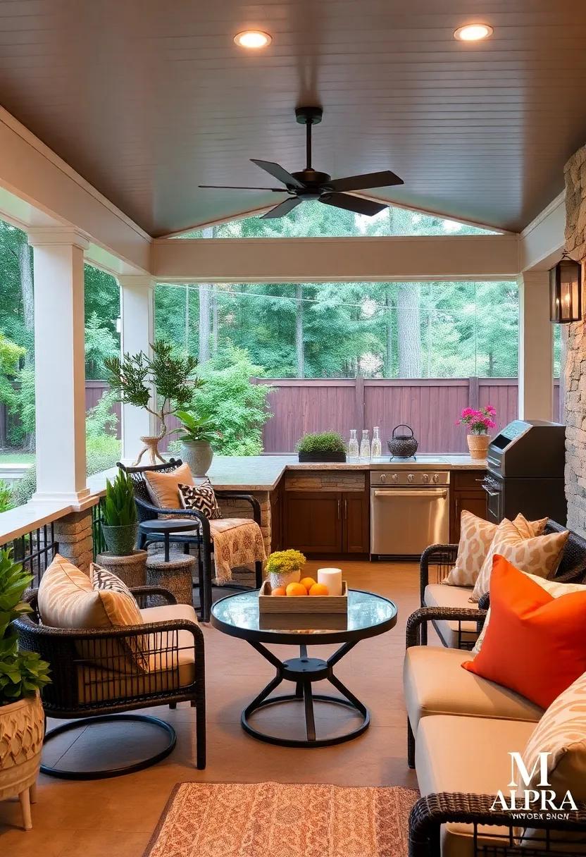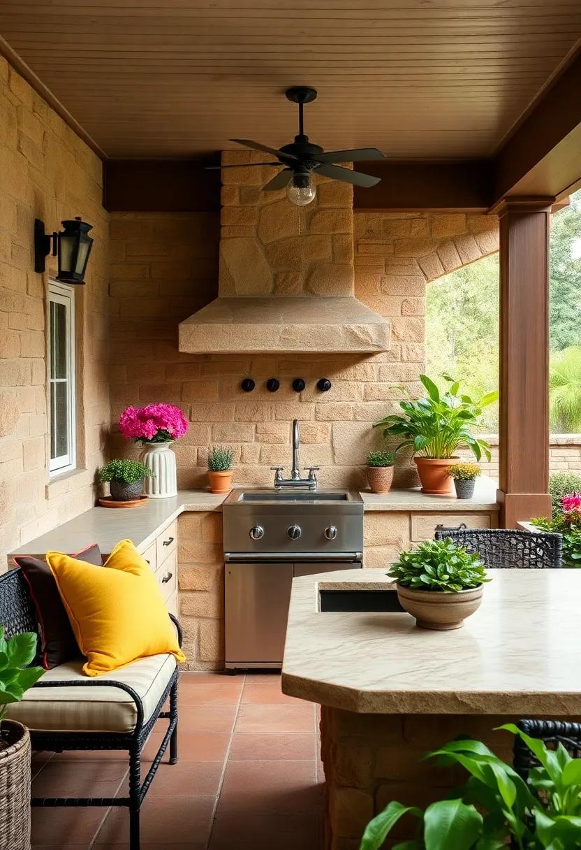 this inviting space can be adorned with nostalgic details that tell a story. Think antique light fixtures casting a warm glow and charming, hand-painted tiles that add personality to your kitchen. You can elevate this ambiance with functional modern conveniences such as energy-efficient appliances, built-in storage solutions, and easy-clean countertops, ensuring your outdoor kitchen remains practical yet stylish. Consider adding elements like a farmhouse table for dining or wicker furniture for lounging, creating a family-friendly atmosphere that invites everyone to gather, cook, and relax in the comfort of nature.